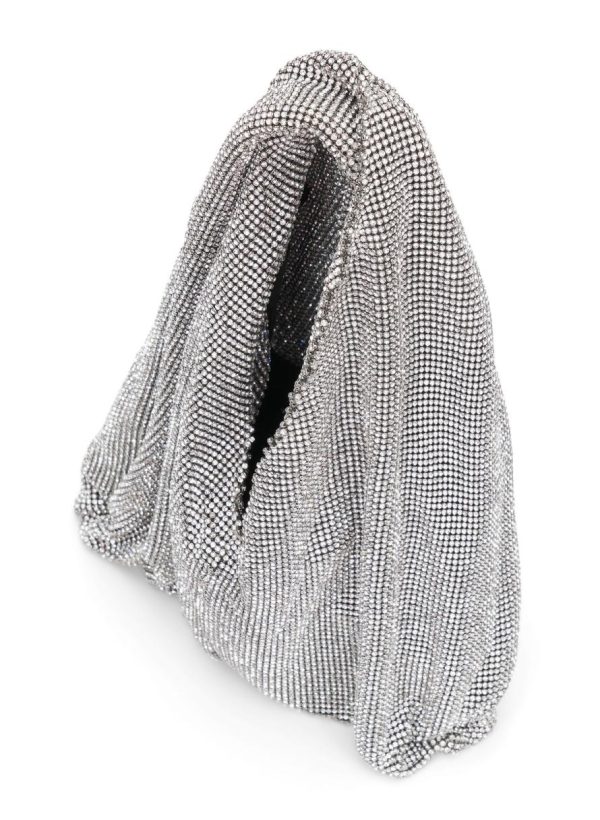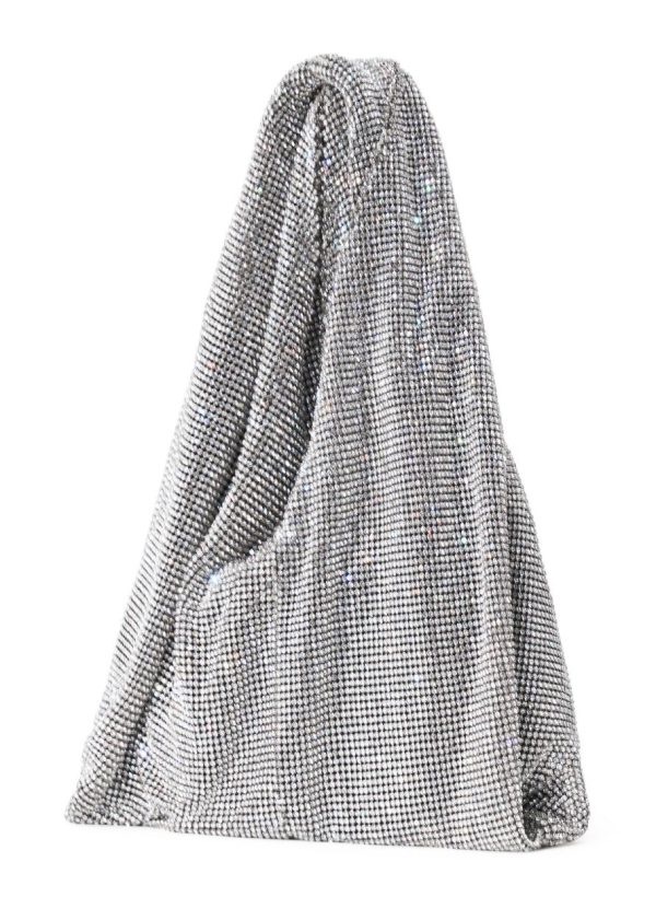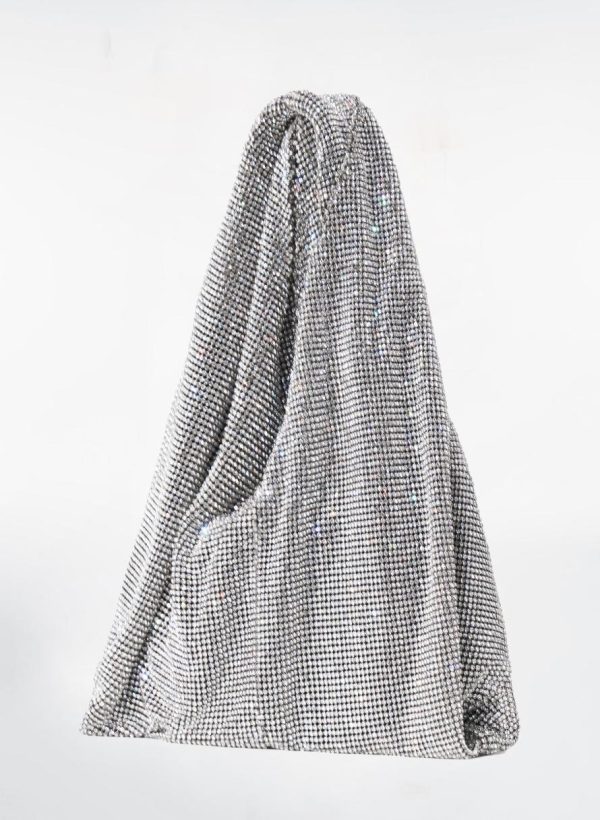 The Paige Bag is crafted of glimmering rhinestone chain mesh in silver. This mini silhouette features a soft, flexible shape with a twisted handle for modern impact.