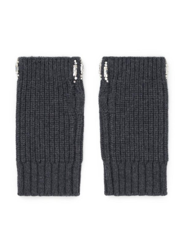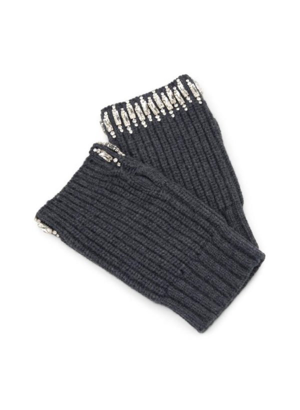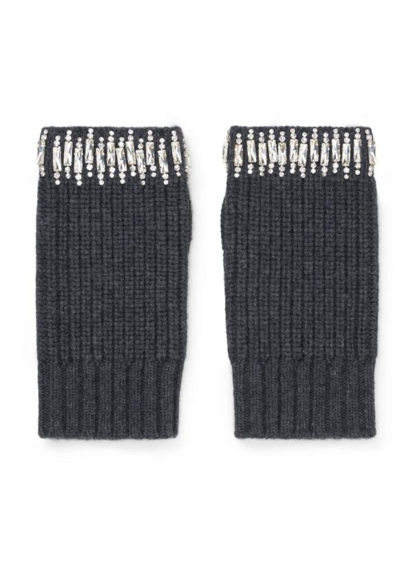 The Rio Glove is knitted from fuzzy wool in a dark heather grey hue. This fingerless silhouette, featuring a ribbed texture, is decorated with silver-toned crystals along the knuckles.