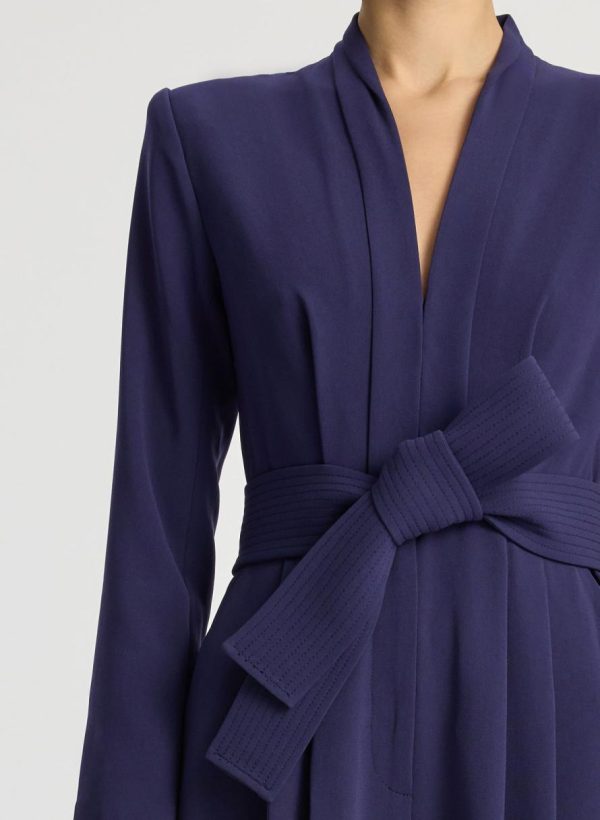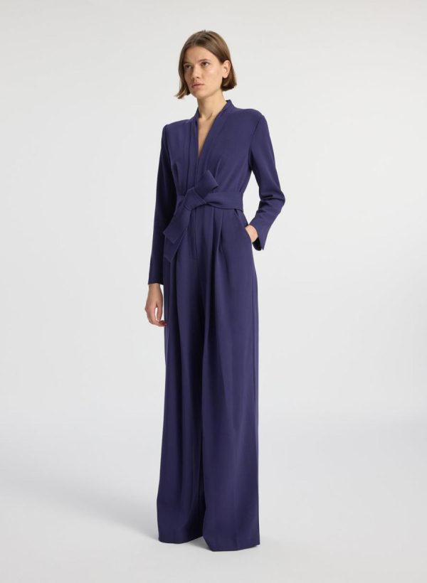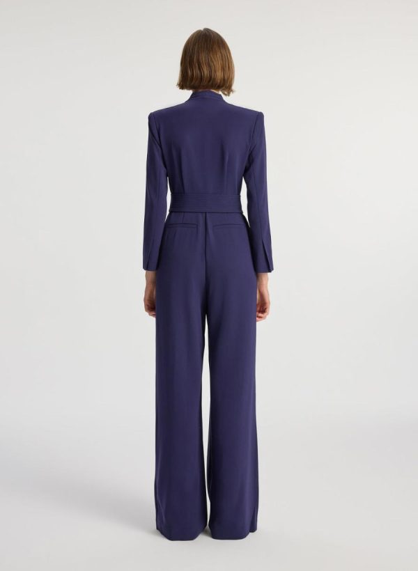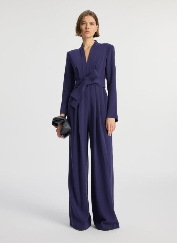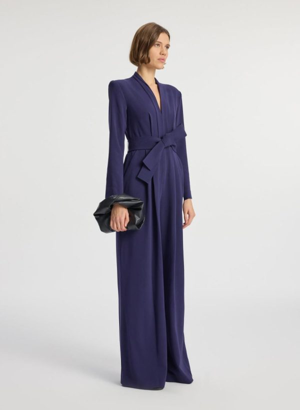 The Kieran II Jumpsuit is impeccably cut from matte deep plum fabric. This tailored silhouette features pleated wide legs and a plunging V-neckline, enhanced with shoulder pads and hook-and-eye detailing for more or less coverage. A detachable structured waist belt completes the look.