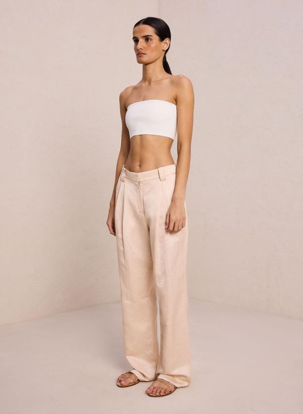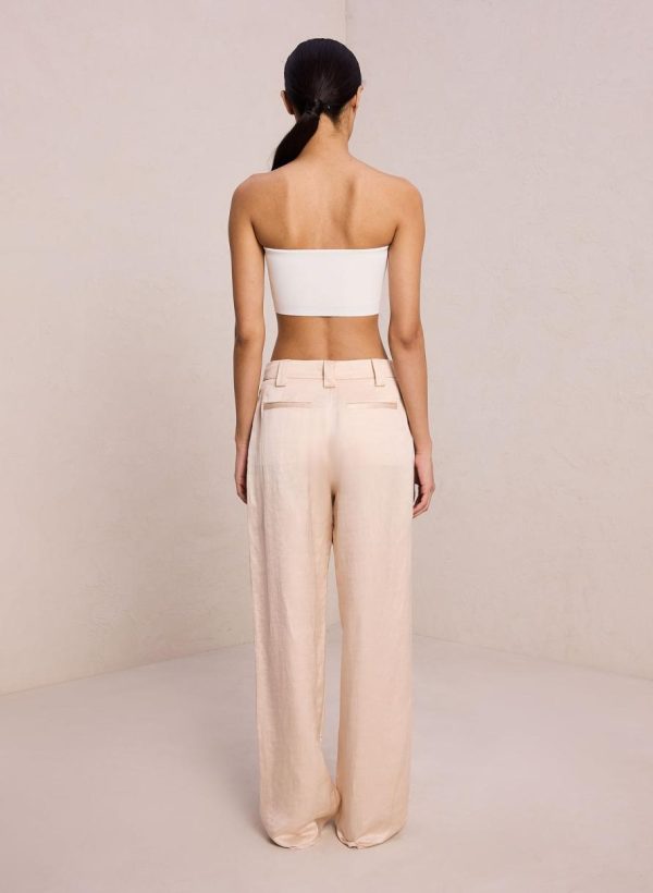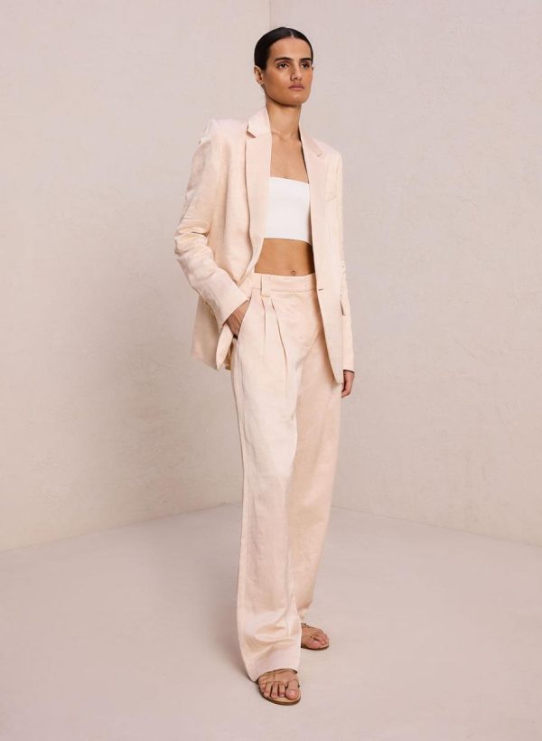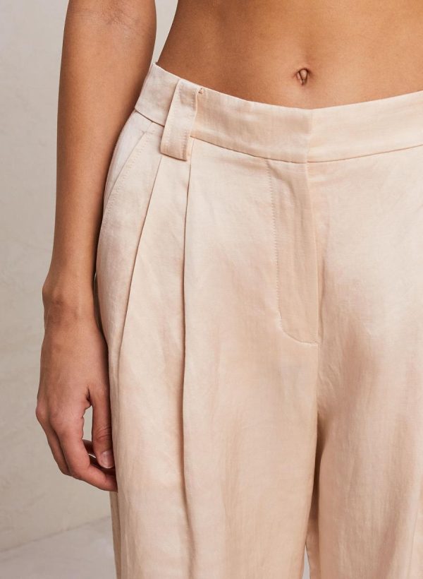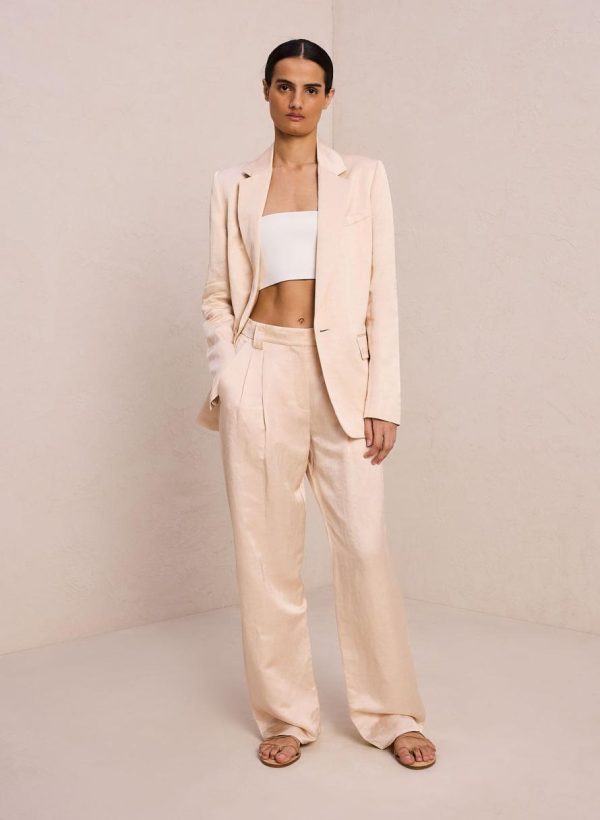 The Mateo Pant is crafted from a shiny linen viscose blend fabric in a creamy hue. This tailored silhouette features pleating, slash pockets, and slouchy straight legs. This style runs true to size.