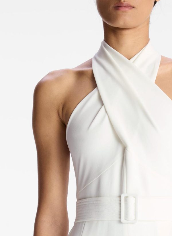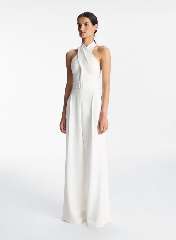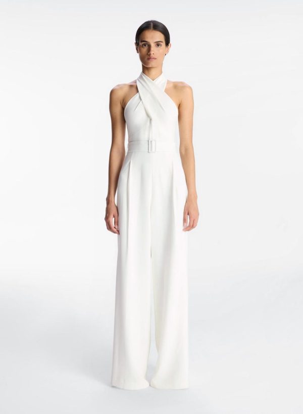 The Murphy Jumpsuit is impeccably cut from structured white cady fabric. This precise silhouette features an overlapping halter neckline, a belted waist, and pleated wide legs.