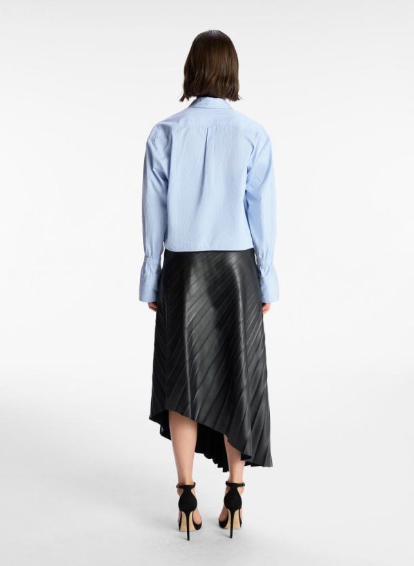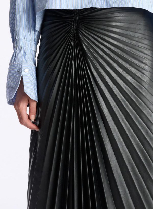The Tracy Skirt is crafted of our luxe vegan leather fabric in timeless black. This midi silhouette features an asymmetrical hem with starburst pleating and ruched detailing at the hip.