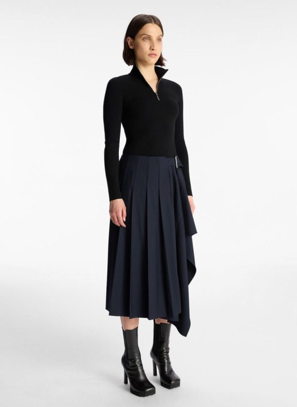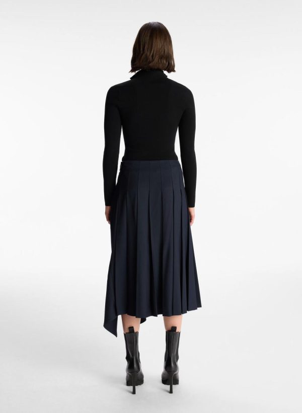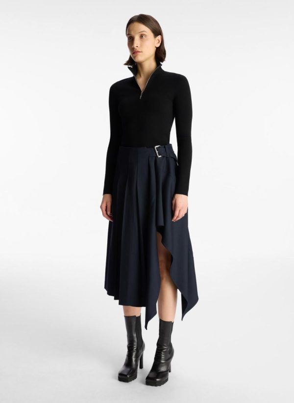 The Wayland Skirt is crafted from a wool blend fabric in rich navy. This midi silhouette features an asymmetrical high-low hemline and a belted waist with a polished silver buckle.