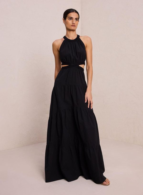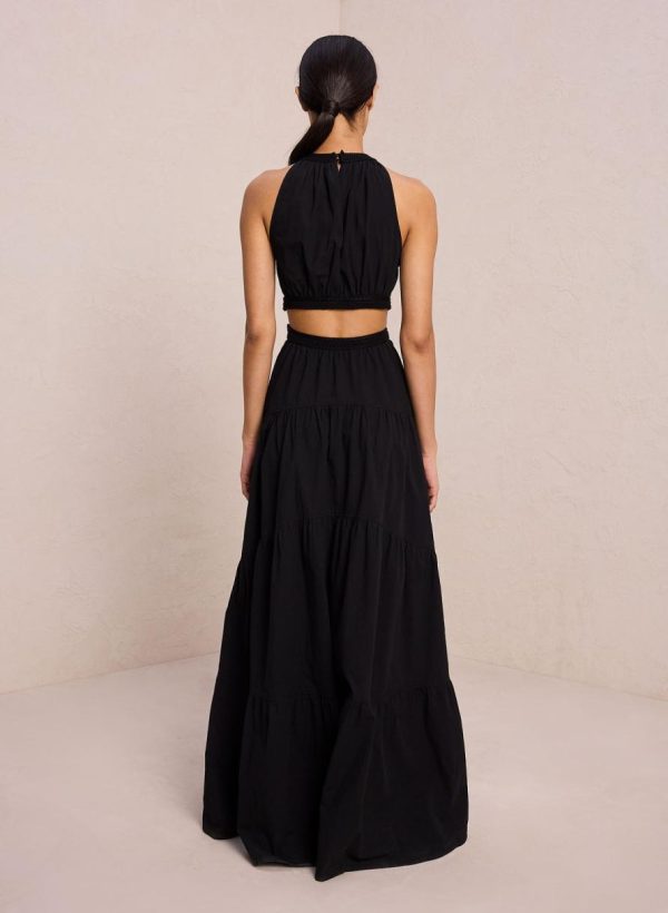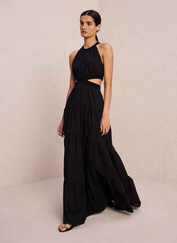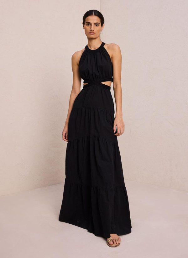The Casey Dress is crafted from a crepe cotton fabric in essential black. This maxi silhouette features an intricately crocheted high neckline and side cutouts, which wrap around to reveal a low open back. A voluminous tiered skirt completes the look for a dynamic warm-weather look. This style runs true to size.