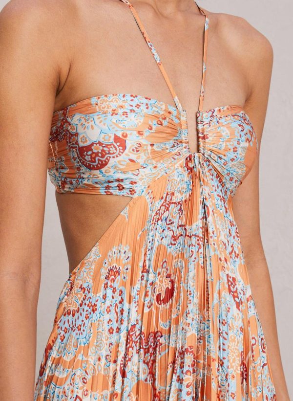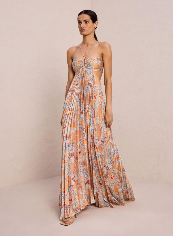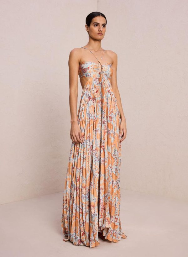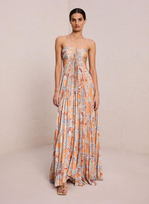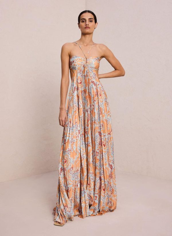The Moira Dress is beautifully pleated and draped from satin chiffon fabric in a printed apricot motif. This full-length gown features delicate multi-wear straps and an empire waist with cutouts that wrap around to reveal an open crisscross tie-back. This style runs true to size.