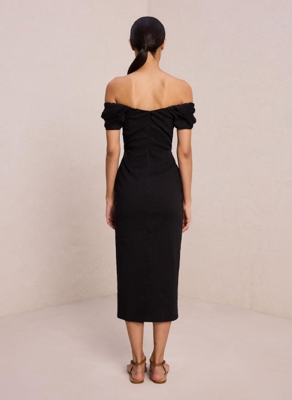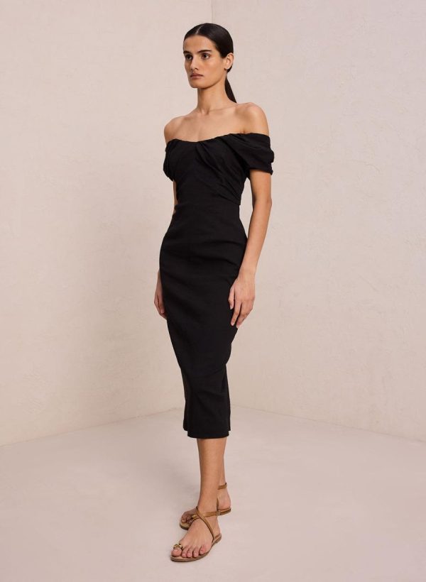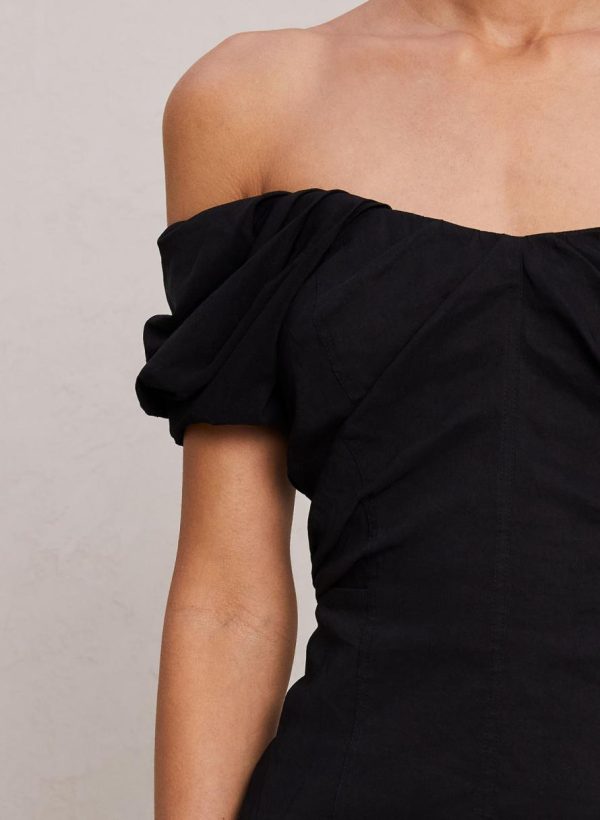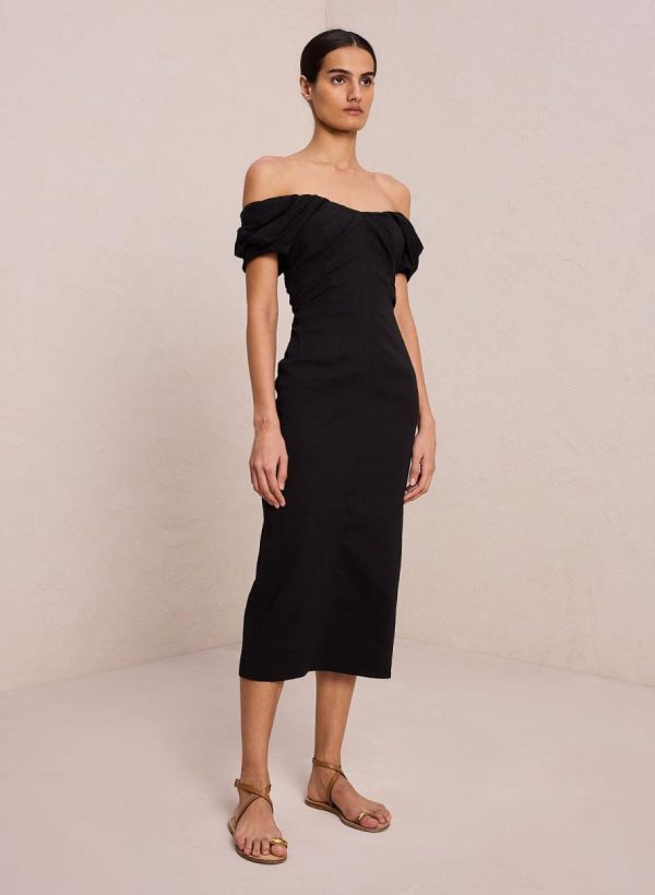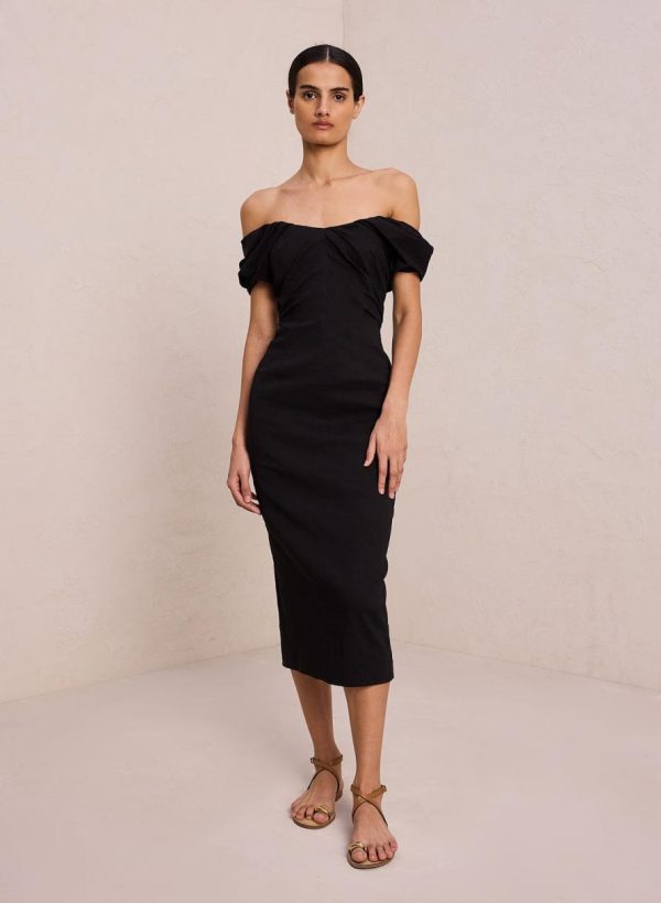 The Nora Dress is crafted from a compact stretch linen fabric in timeless black. This midi silhouette features a romantically draped strapless sweetheart neckline and off-the-shoulder sleeves with shape-accentuating seam detailing. This style runs true to size.