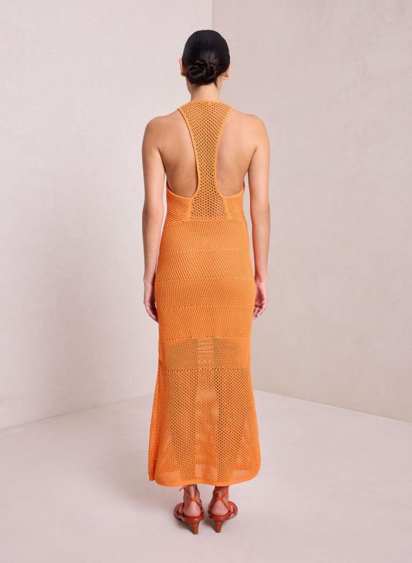 The Roland Dress is knitted from a dry cotton cord fabric in a bright orange shade. This midi silhouette is intricately detailed with a warm-weather feel, featuring crochet detailing, a round neckline, racerback, and partial lining. This style runs true to size.