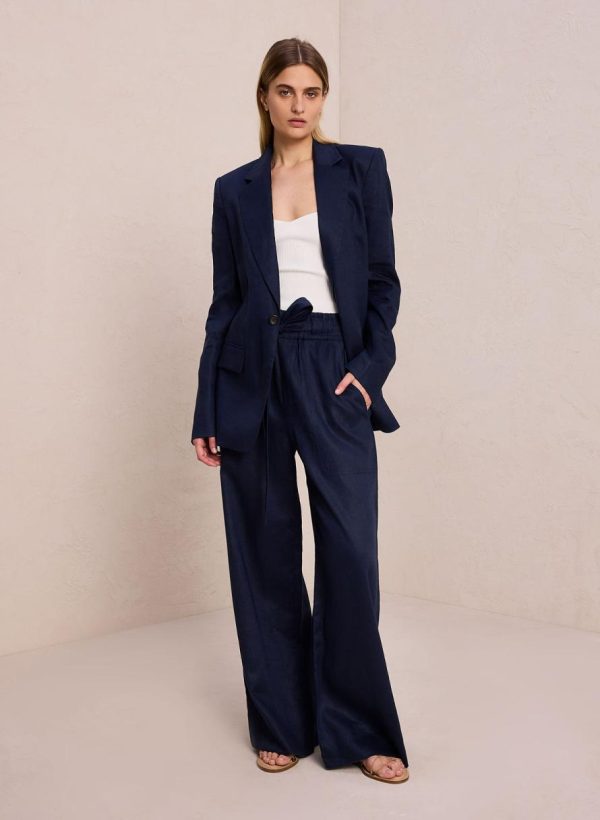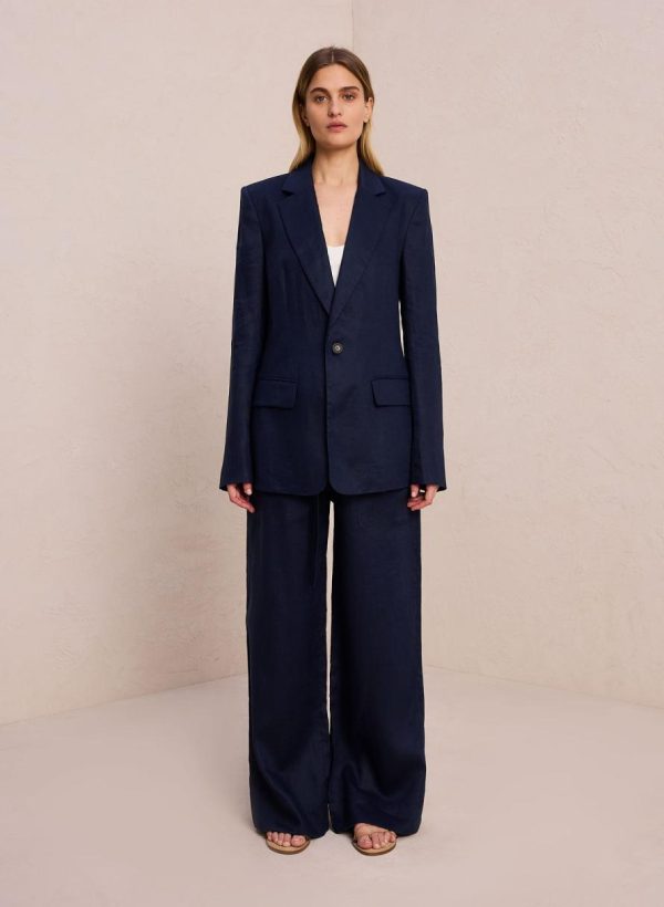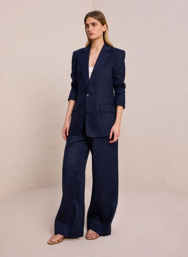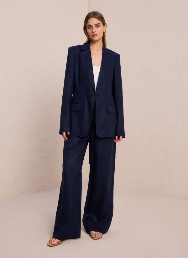 The Arlo Jacket is crafted from solid relaxed linen fabric in a deep blue hue. This structured silhouette features notched lapels, a single button closure, flap pockets, and a back vent. This style runs true to size.