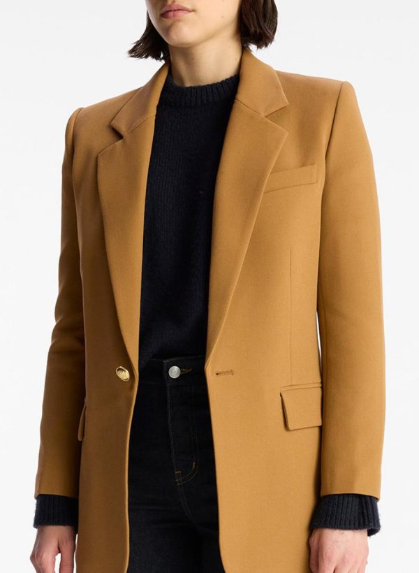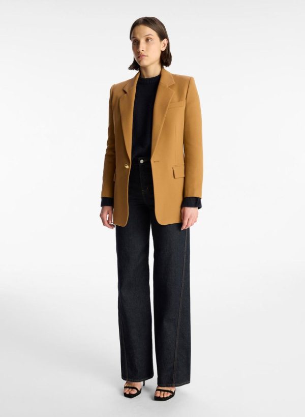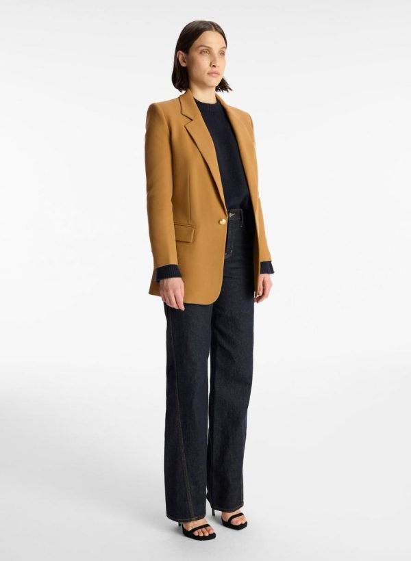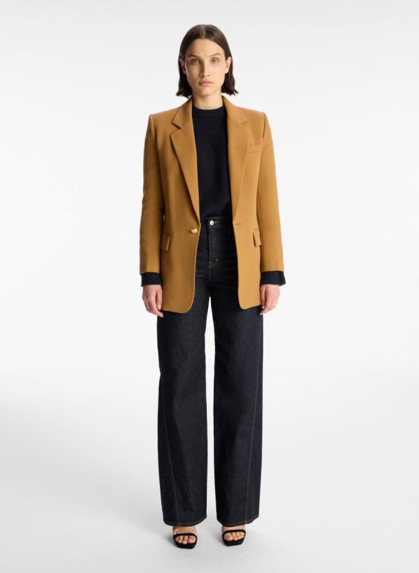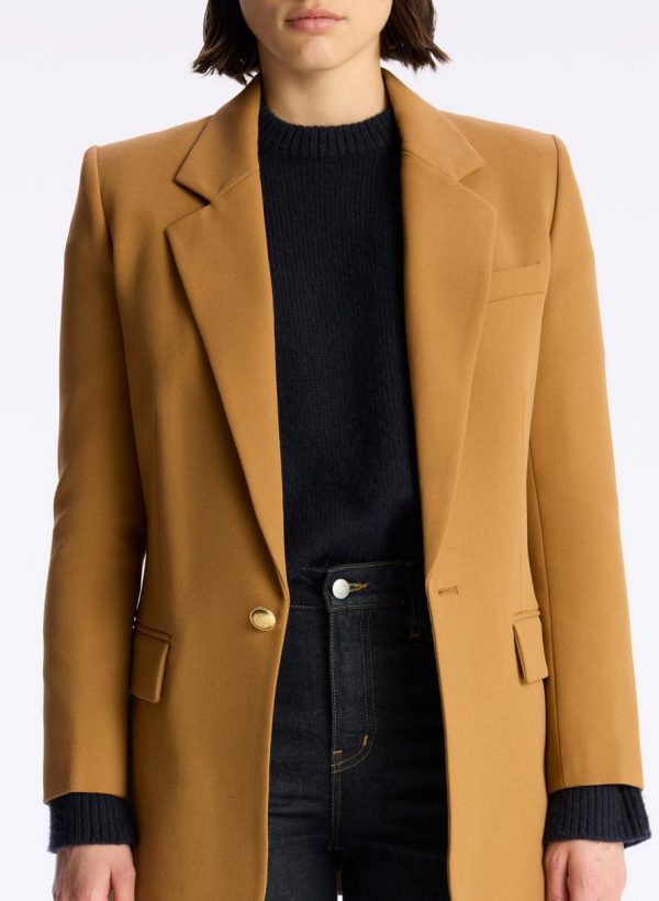 The Davin Jacket is crafted from our signature suiting blend fabric in a classic khaki hue. This straight-fitting boxy silhouette features notched lapels, flap pockets, and bracelet sleeves. Gold-toned buttons along the cuffs and single-button closure complete the look.