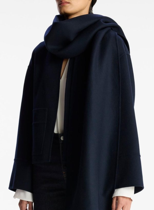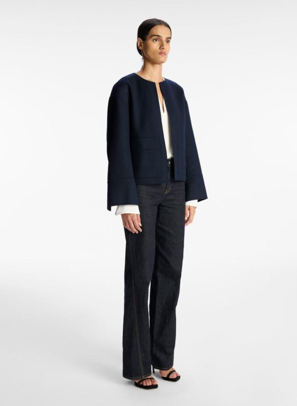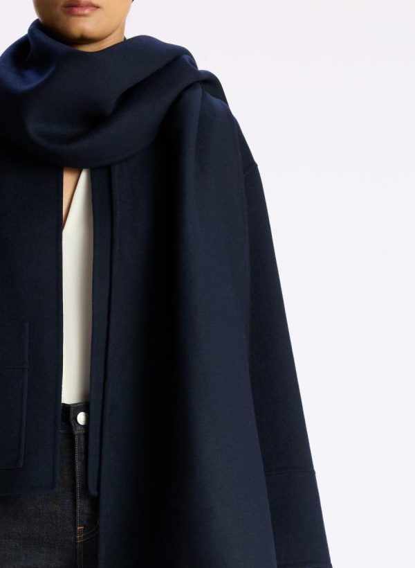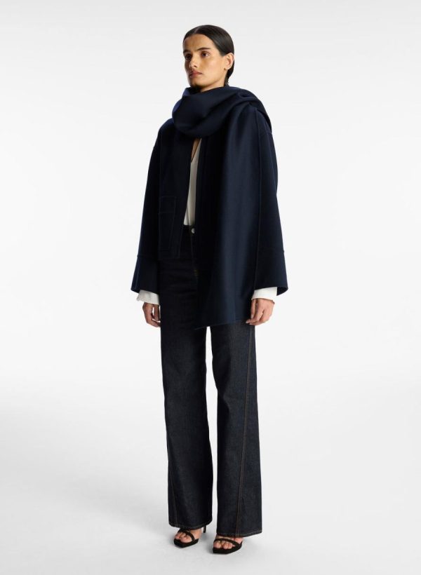 The Finley Jacket is crafted of luxurious wool in a deep navy shade. This boxy silhouette features a clean, minimal design with a round open neck, long bell sleeves, and front patch pockets. A removable shawl collar completes the look, designed to be draped around the neck like a scarf.