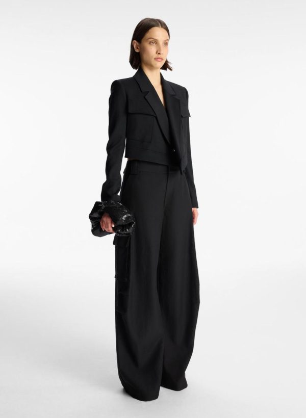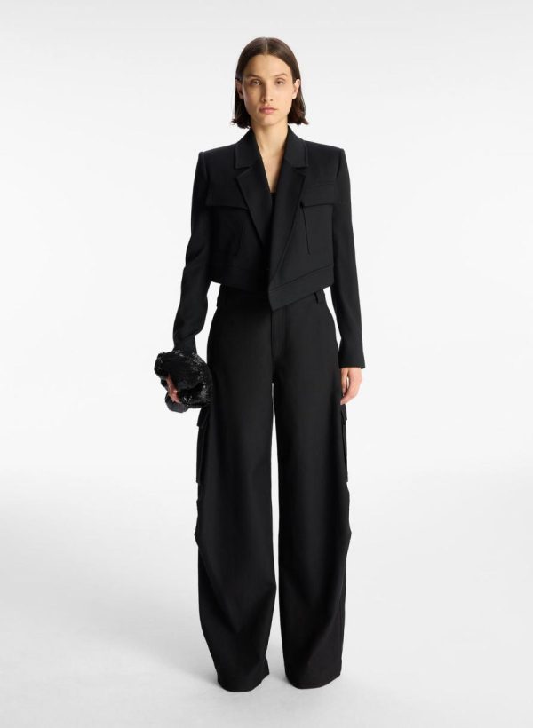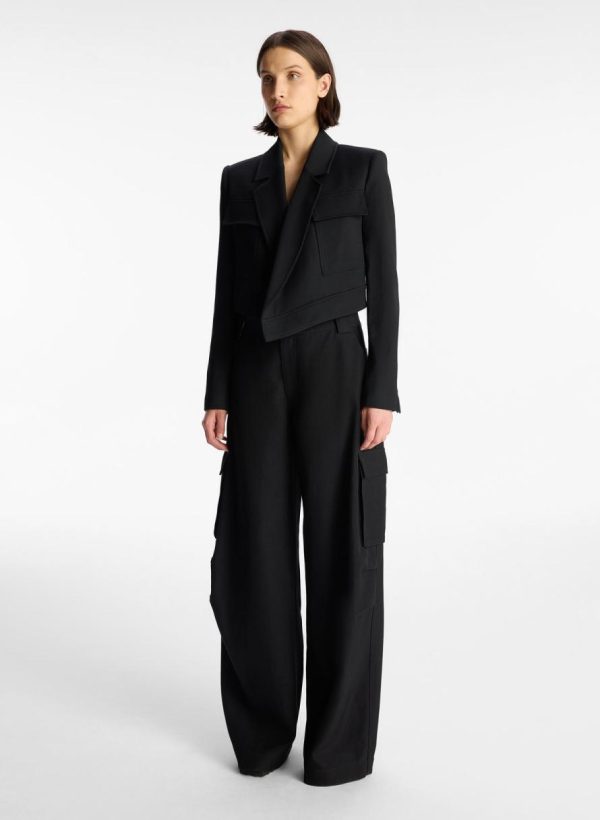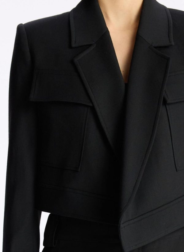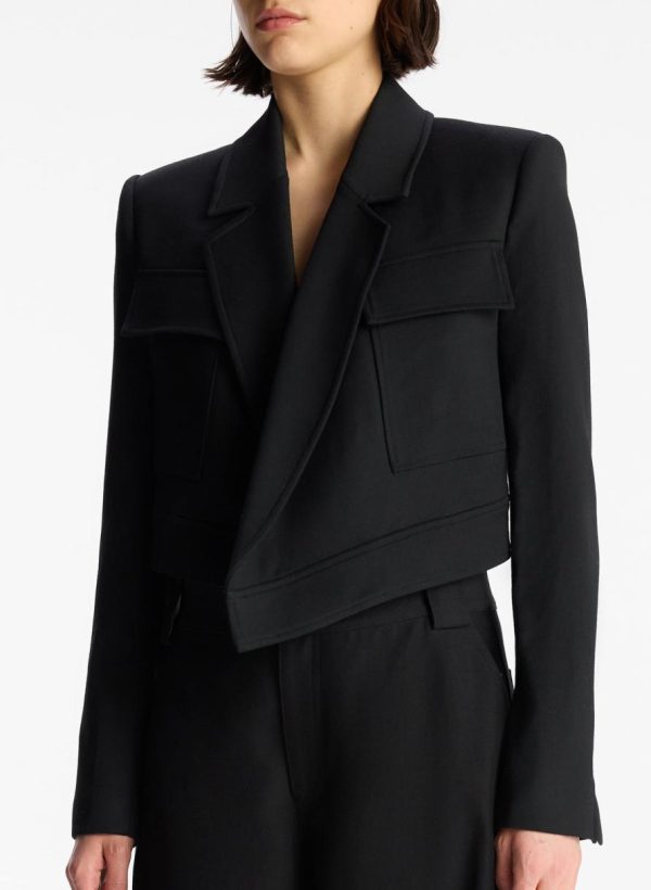 The Reeve Jacket is crafted from a structured blend of cotton viscose fabric in vibrant red. This cropped blazer silhouette is sharp and confident, featuring crossover, asymmetrical lapels, flap pockets, and a single-button closure.