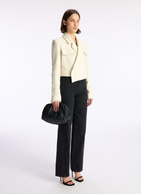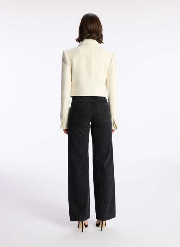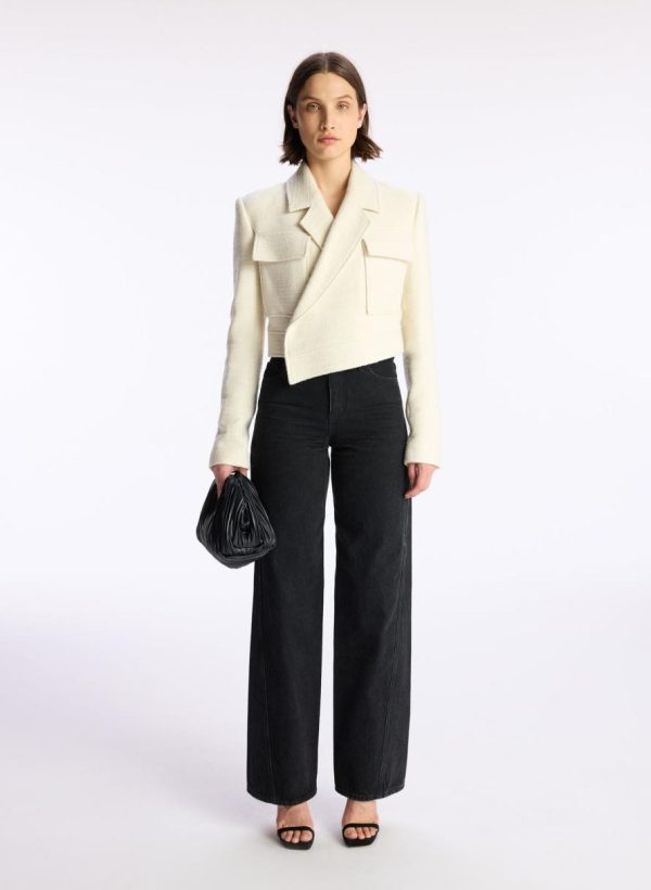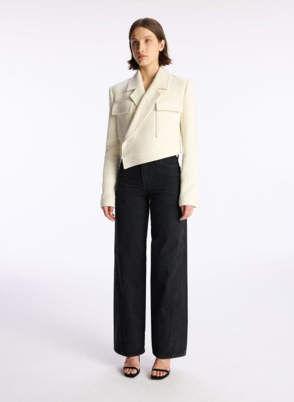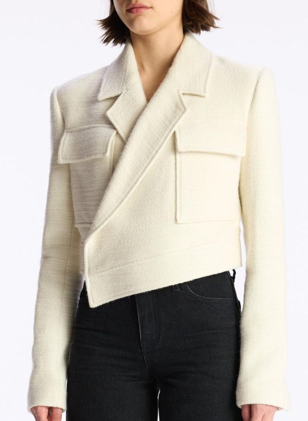 The Reeve Jacket is crafted of textured wool tweed in a timeless cream hue. This cropped blazer silhouette is sharp and confident, featuring crossover, asymmetrical lapels, flap pockets, and a single-button closure.