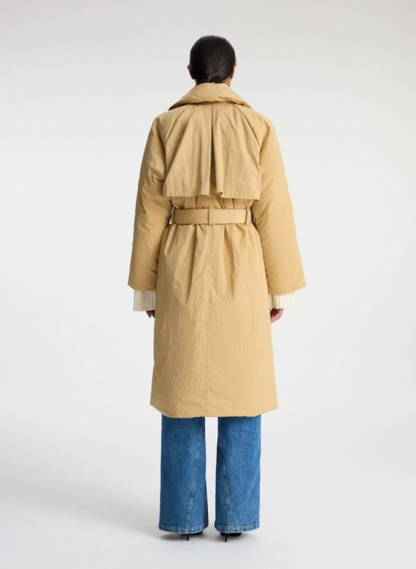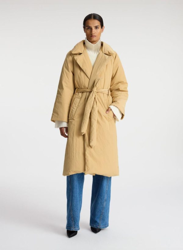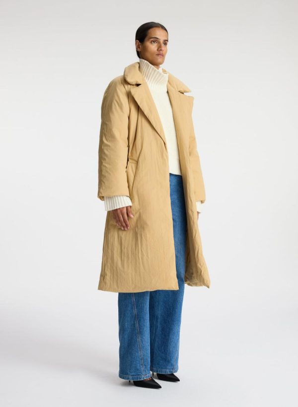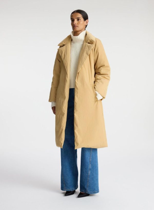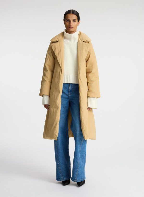 The Sterling Coat is crafted of our luxe nylon quilted fabric in a sandy tan hue. This long silhouette features an oversize collar with notch lapels, deep front pockets, and a belted waist.
