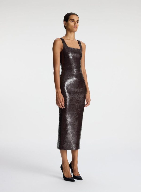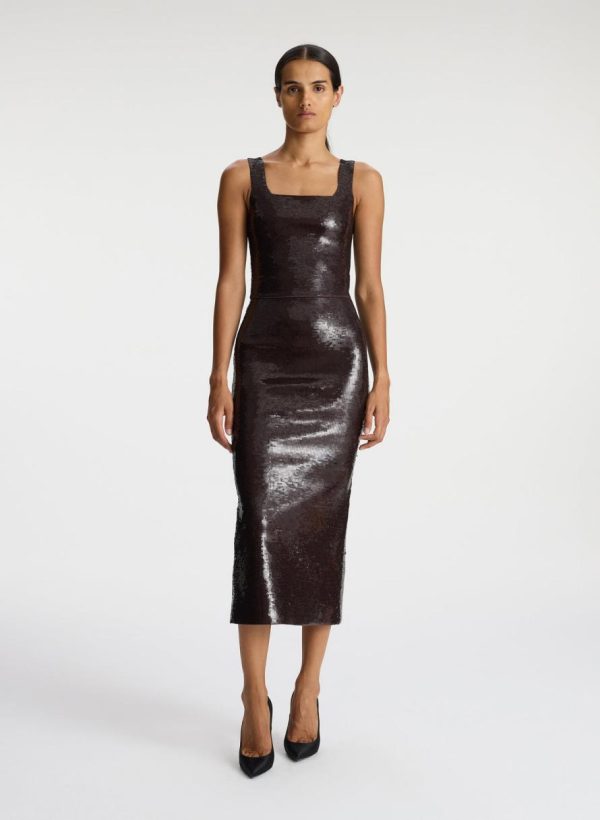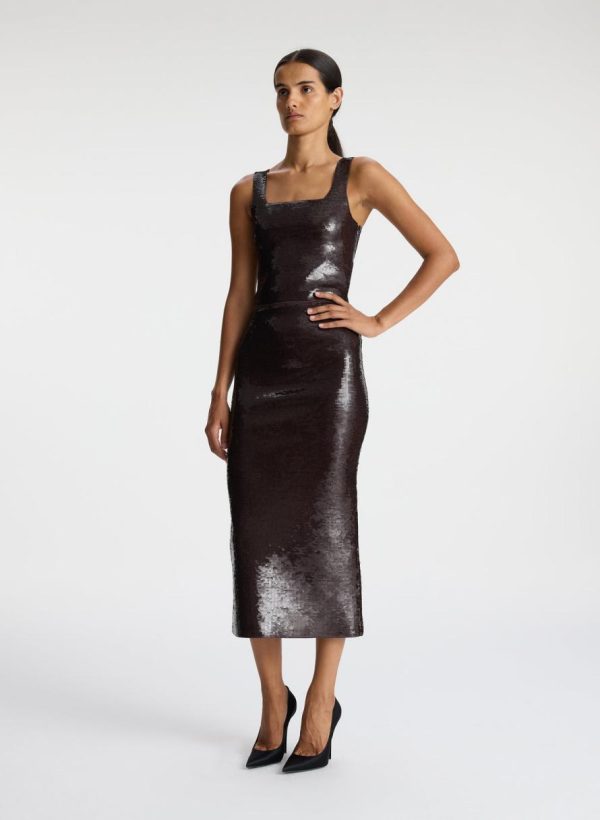 The Joan Skirt is crafted of our sequin-adorned compact knit fabric in a deep brown hue. This fitted midi silhouette features an elasticized waist with a concealed side zipper and back slit for effortless movement.