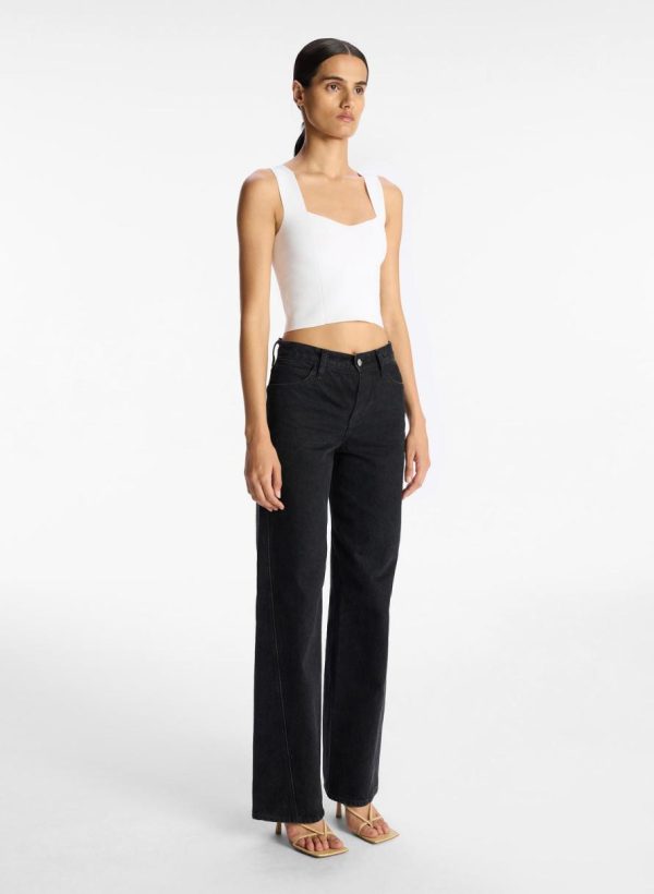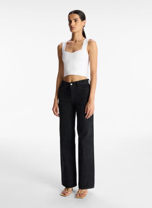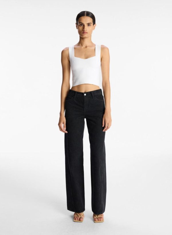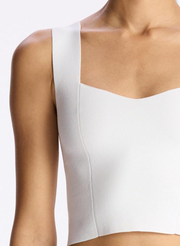 The Jordana top, a part of A.L.C.’s Signature Collection, is knitted from soft ribbed viscose in versatile white. This fitted silhouette features a cropped fit with an open neckline and thick straps.