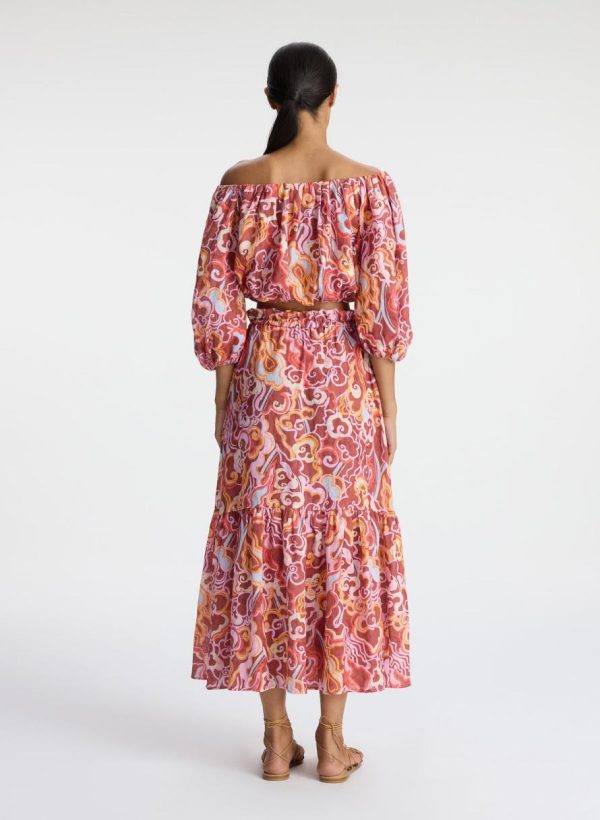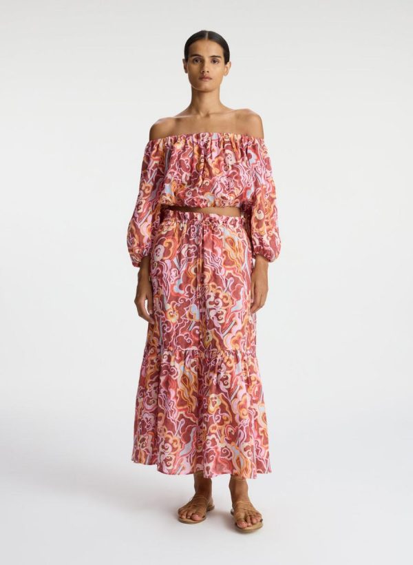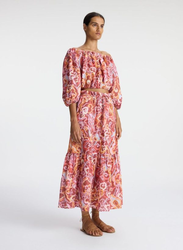 The Katherine Top is crafted of our linen fabric in an abstract clay floral print. This cropped, off-the-shoulder silhouette features an elasticized neckline and hem with long billowing sleeves and pleated detailing.