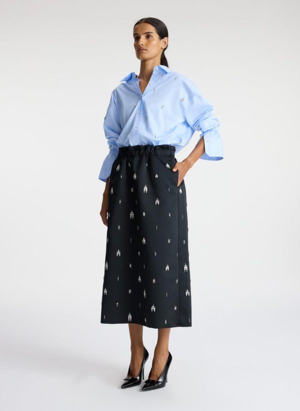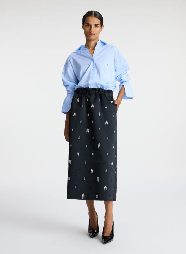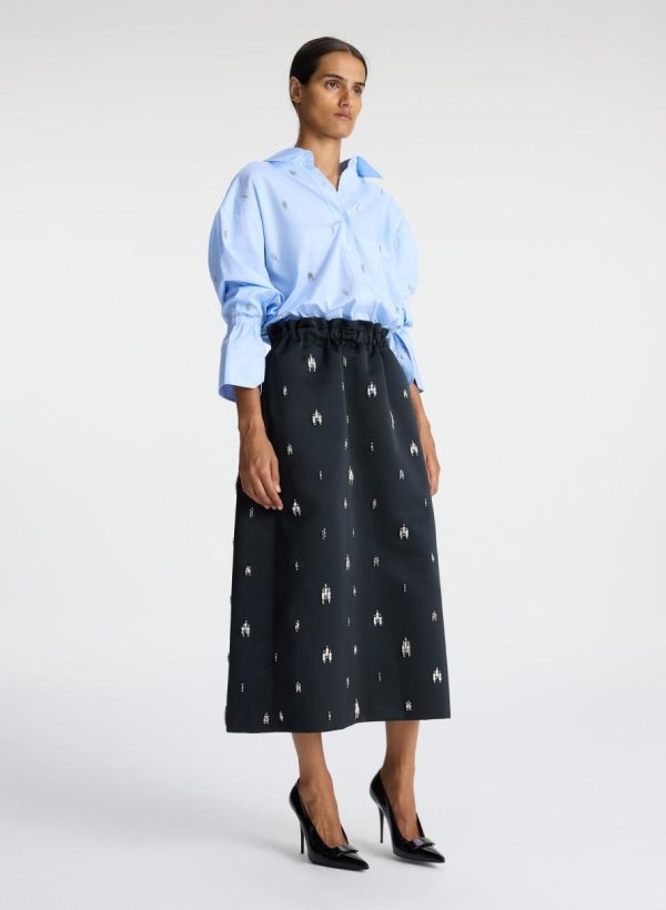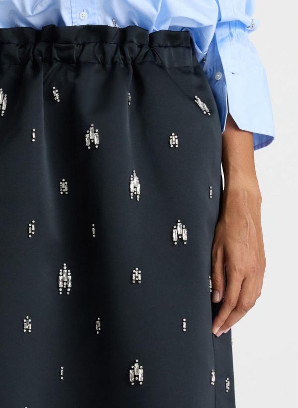The Alexia Skirt is crafted of our heavyweight satin fabric in timeless black. This full midi silhouette is embellished with crystal rhinestones, featuring a gathered stretch waist and pockets. This style runs large.