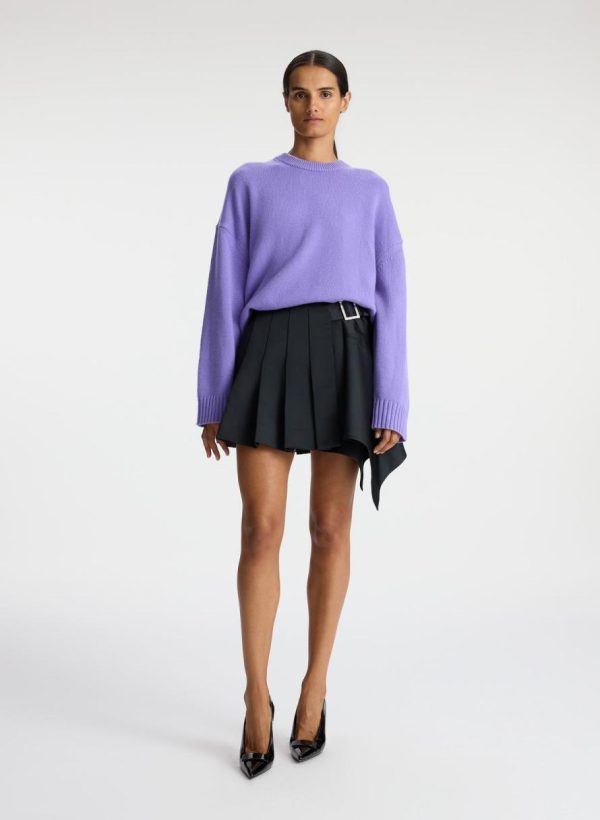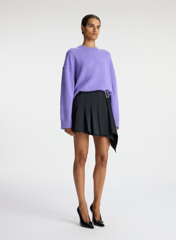 The Mara Skirt is crafted of our heavyweight satin fabric in timeless black. This mini wrap silhouette features pleating and an asymmetrical fishtail hemline. A rhinestone-adorned buckle completes the look.