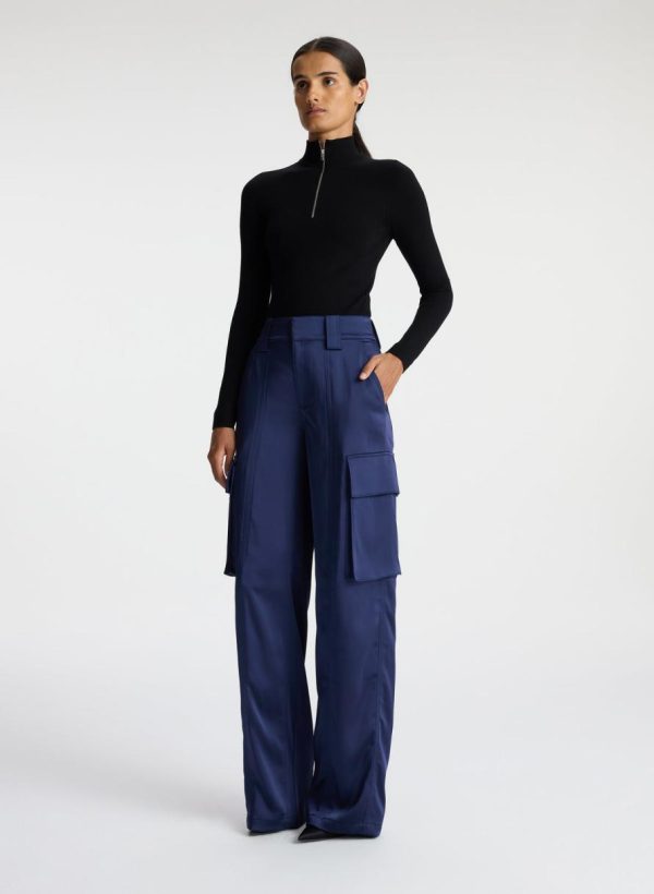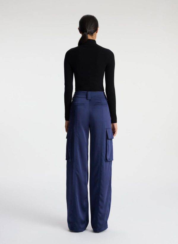 The Bryan Pant is crafted of our drapey satin fabric in a rich blue hue. This mid-rise silhouette is detailed with topstitching, slash pockets at the hips, and large cargo pockets along the sides of the roomy straight legs.