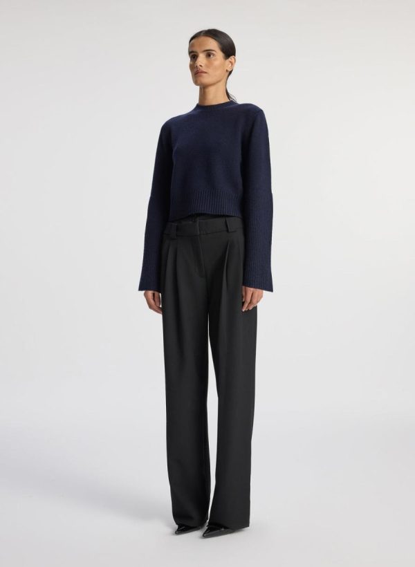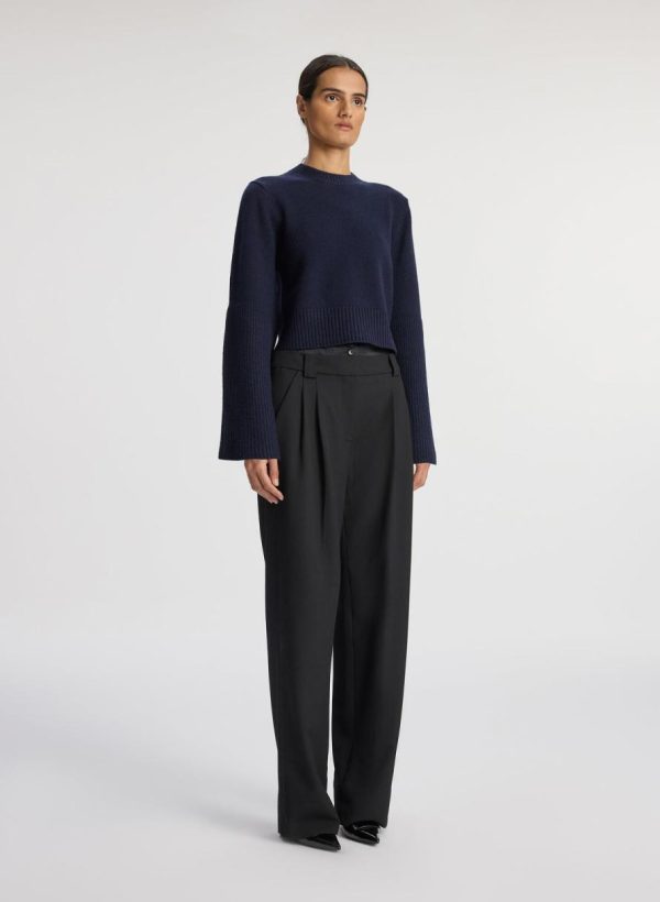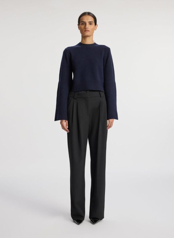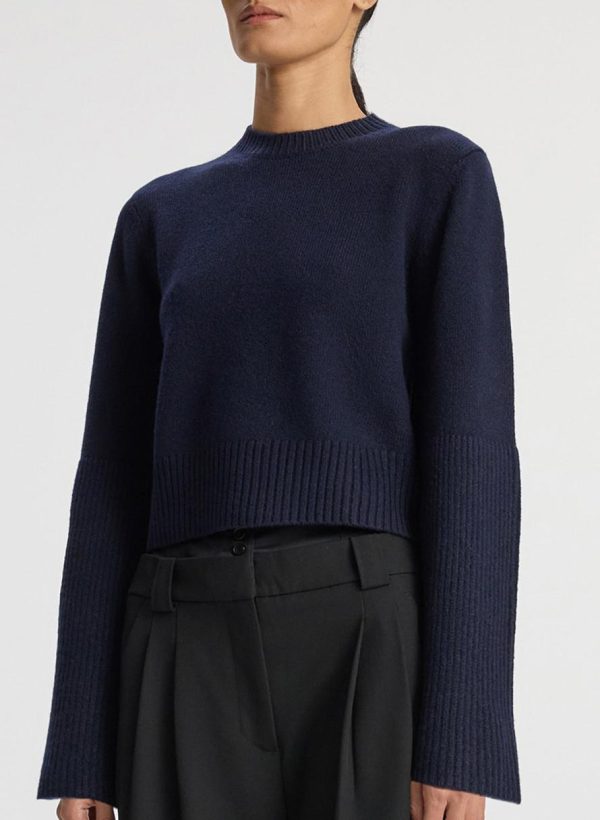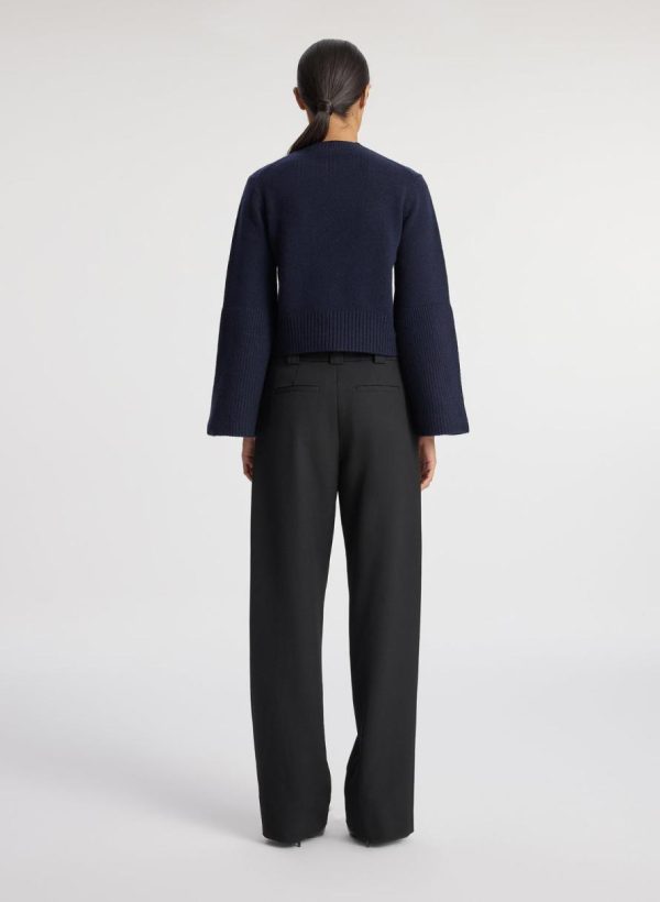 The Clover Sweater is knitted from a wool nylon blend in timeless navy. This cropped silhouette features a short mock neckline and long bell sleeves.