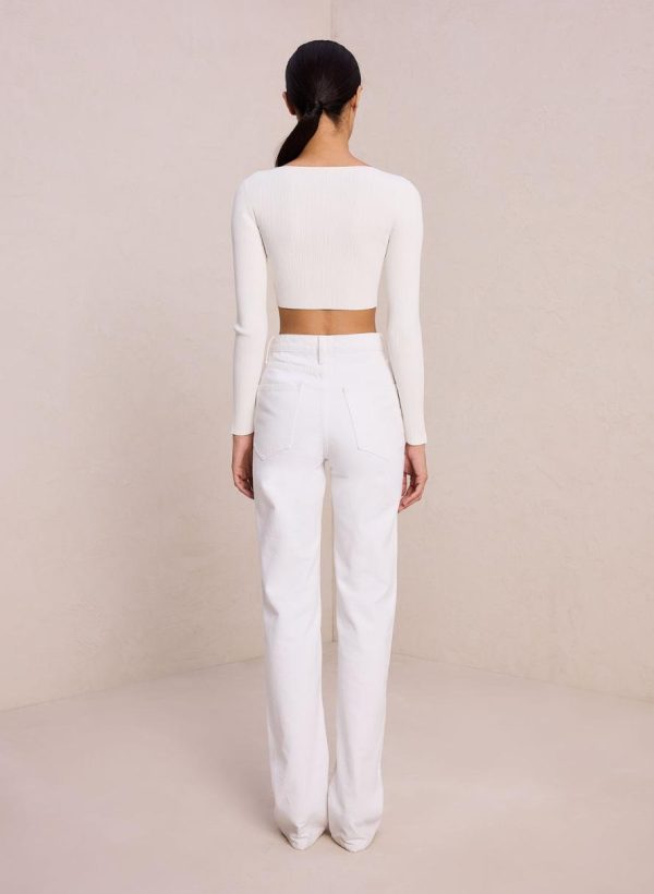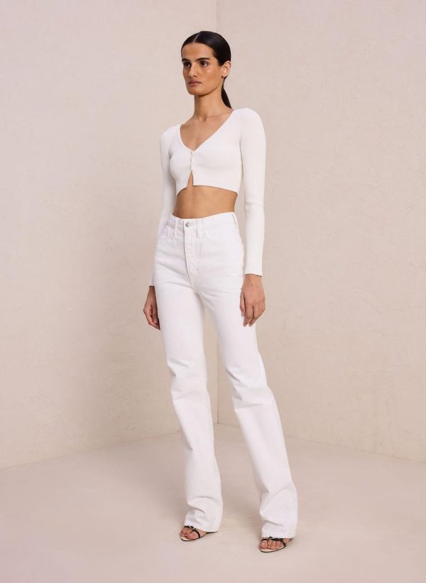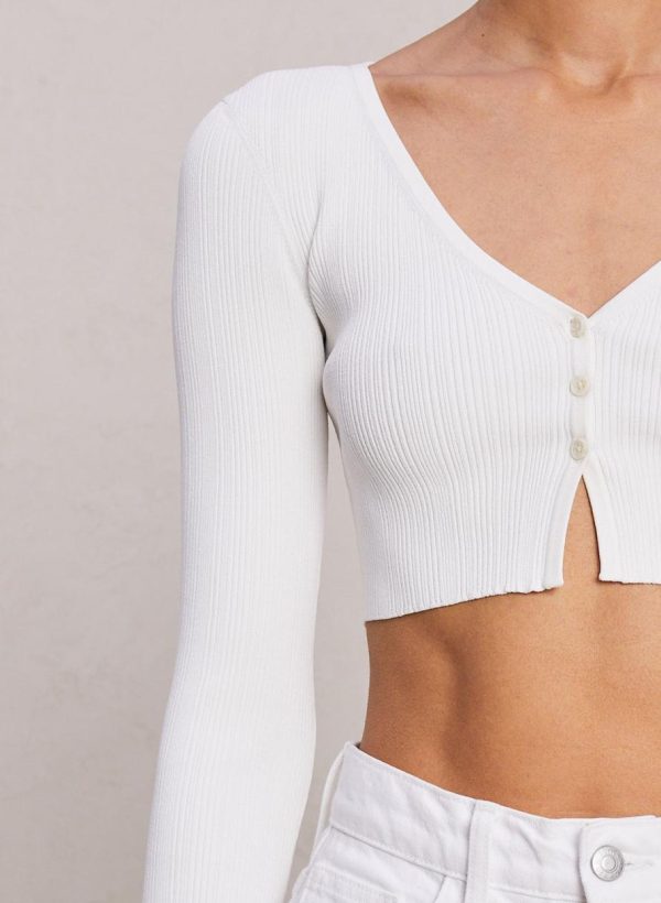 The Hallie II Cardigan is knitted from a dry rayon viscose fabric in a soft cream hue. This cropped silhouette features long sleeves, a V-neckline, and three buttons with a notched detail when secured. This style runs true to size.