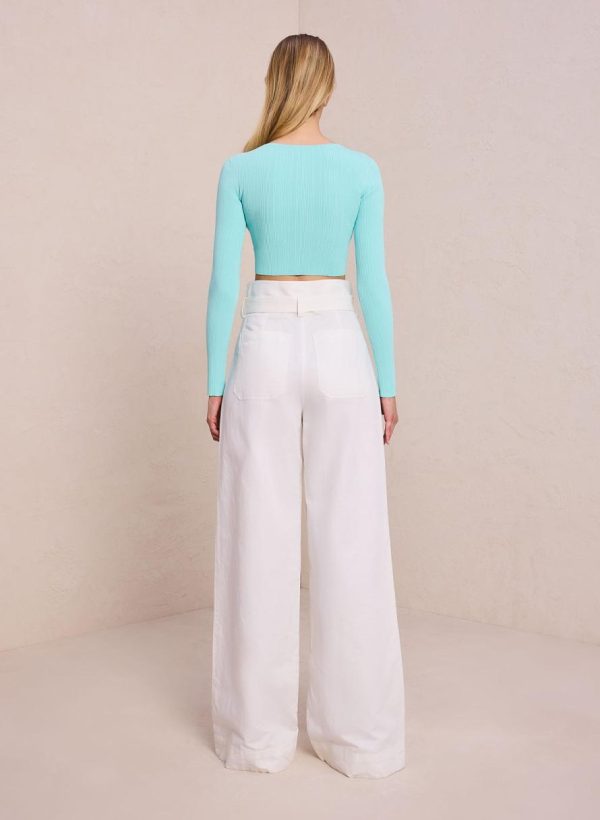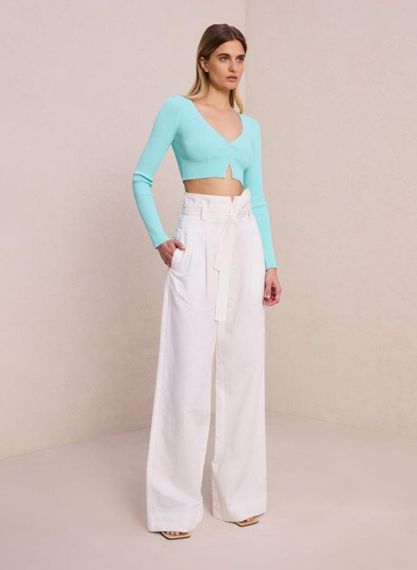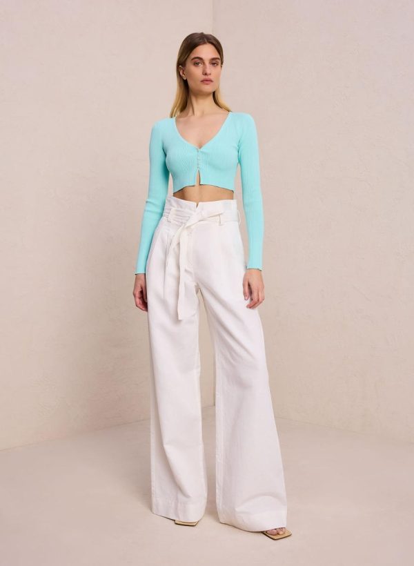 The Hallie II Cardigan is knitted from a dry rayon viscose fabric in a pastel turquoise hue. This cropped silhouette features long sleeves, a V-neckline, and three buttons with a notched detail when secured. This style runs true to size.