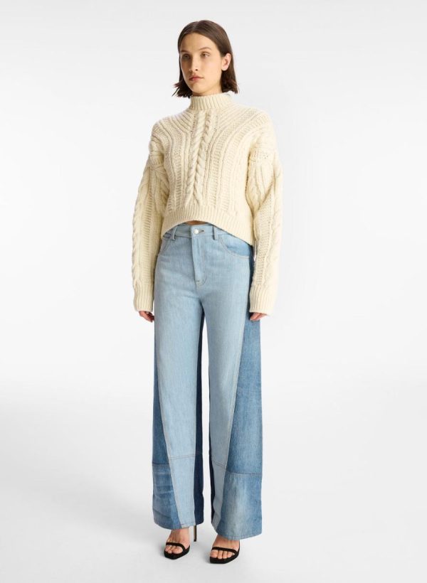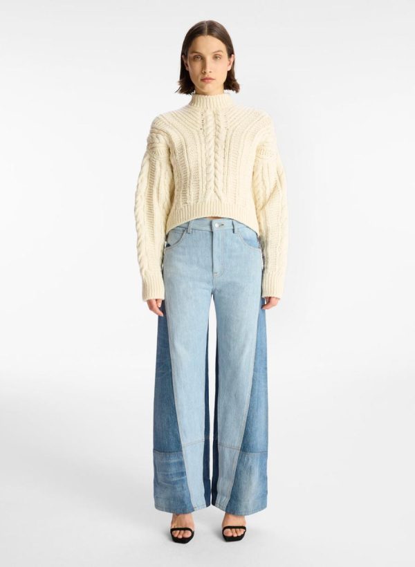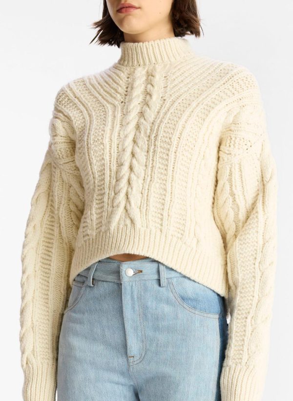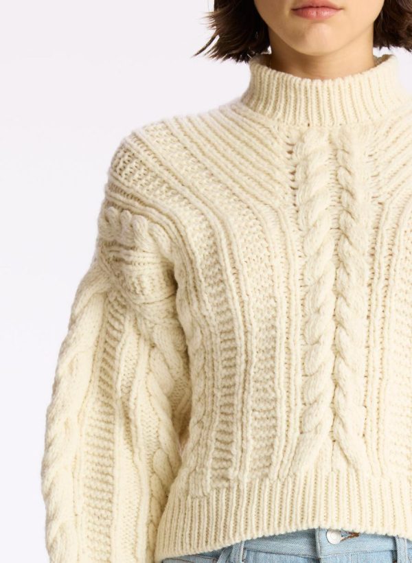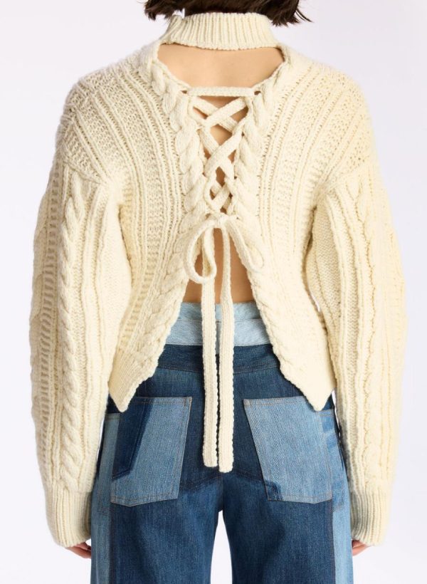 The Shelby Sweater is knitted of 100% luxurious wool in a natural ivory shade. This modern cable knit features a mock neckline, voluminous sleeves, and an open back with intricate lace-up detailing.