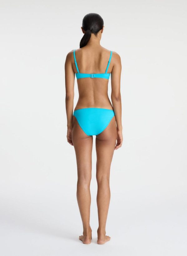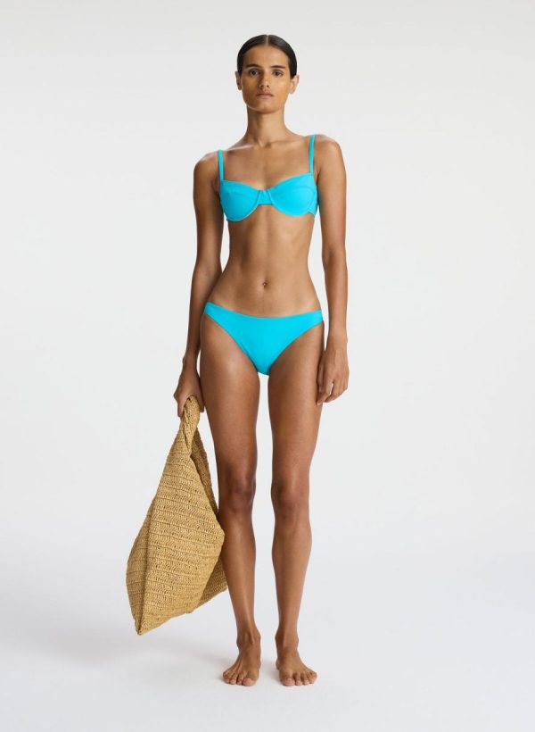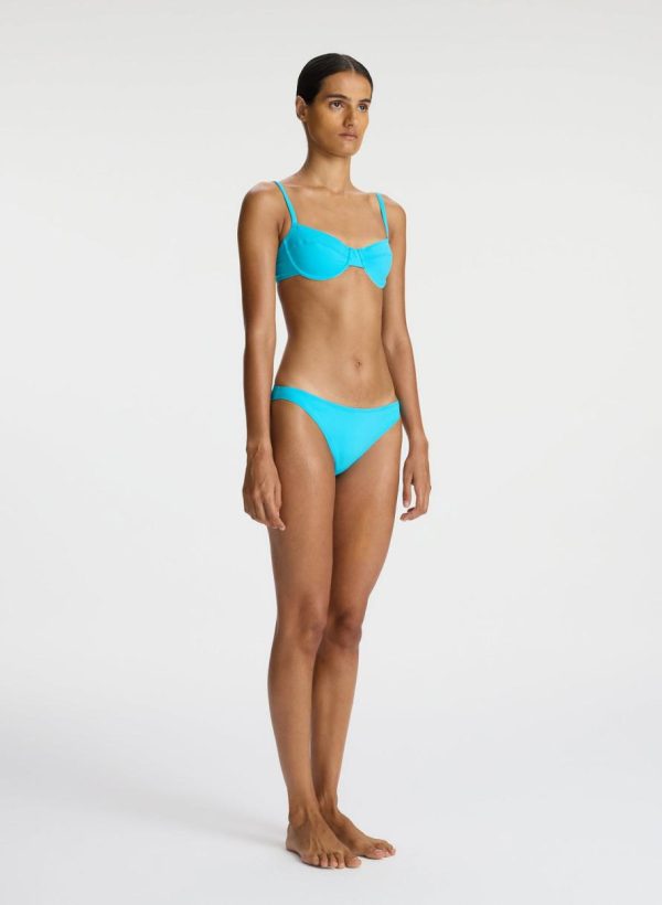 The Amber Bottom is crafted of sculpting stretch fabric in an aqua-blue hue. This minimal silhouette offers medium coverage with a low rise.