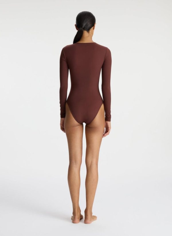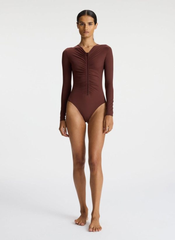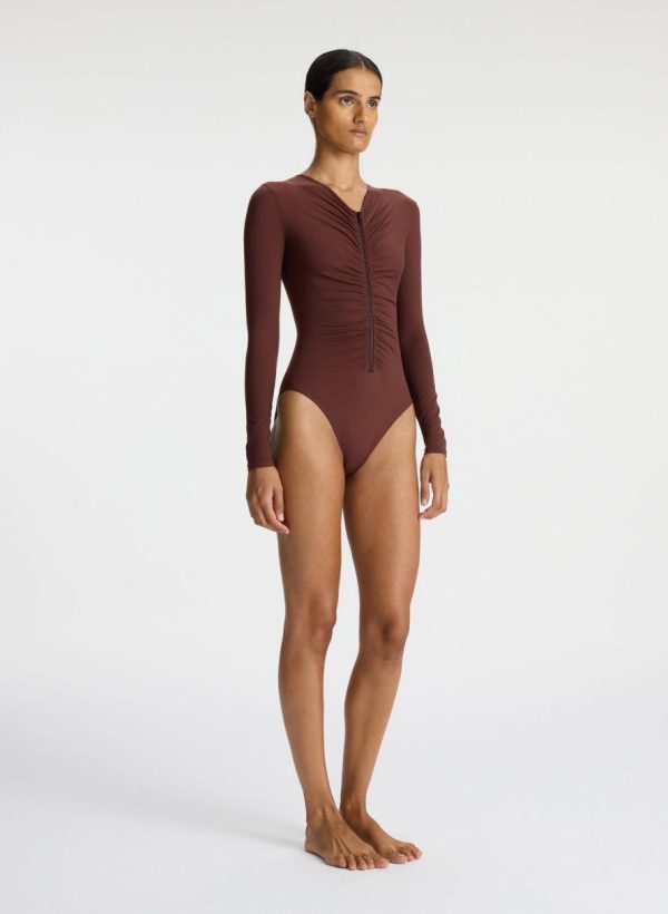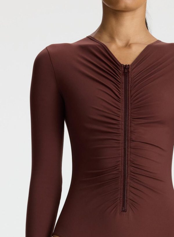 The Ansel Swimsuit is crafted of sculpting stretch fabric in a chocolate brown hue. It features long sleeves, ruched detailing with a zippered front, and high-cut legs.
