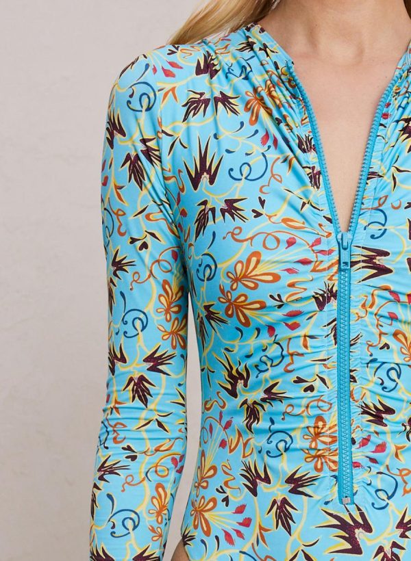 The Ansel Swimsuit is crafted from a recycled nylon stretch blend in a turquoise bird of paradise motif. It features long sleeves, ruched detailing with a zippered front, and high-cut legs. This style runs true to size.