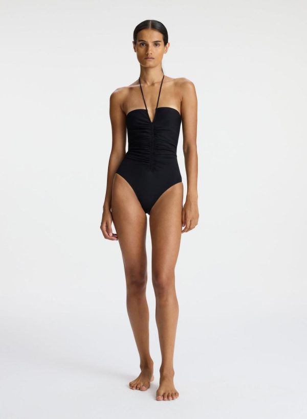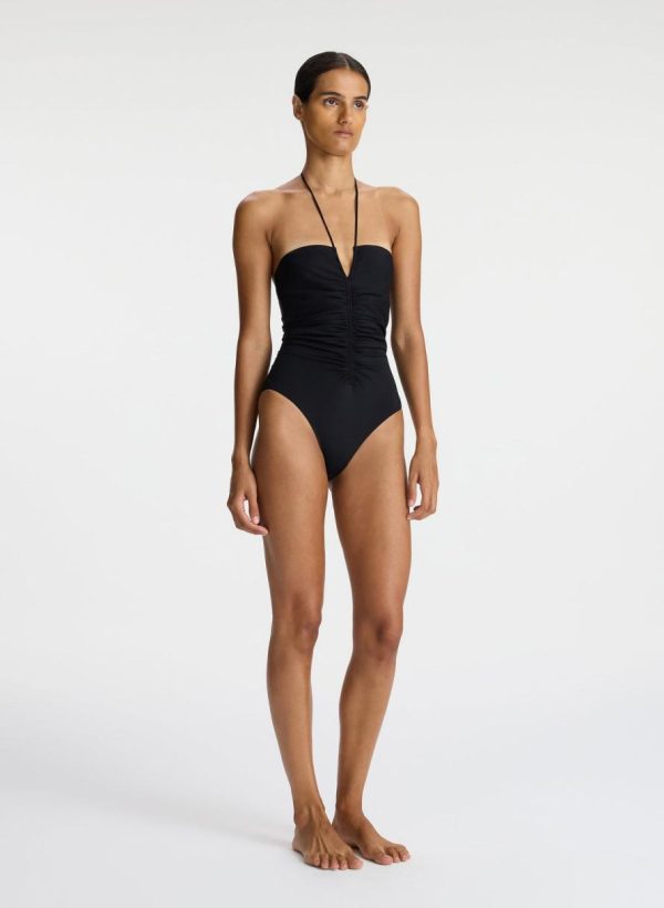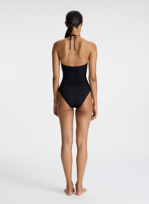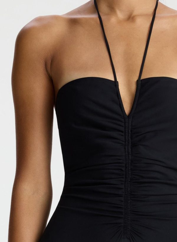 The Gabriela One Piece is crafted of sculpting stretch fabric in timeless black. It features a halter neckline with thin, adjustable ties and ruched detailing through the front and back.