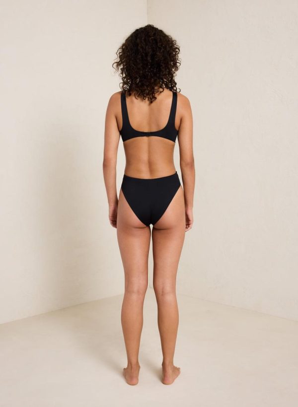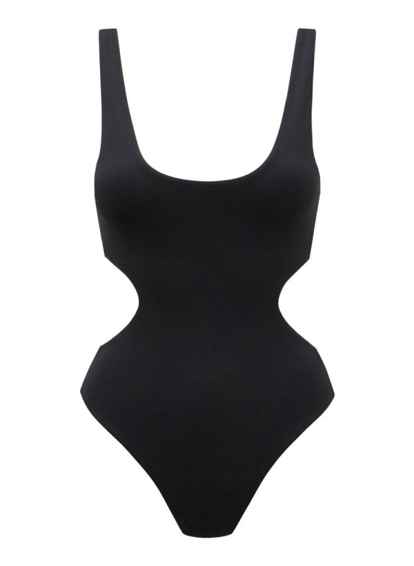 The Nicole Swimsuit is crafted from our soft recycled nylon blend in timeless black. A scooped square neckline and waist cutouts that wrap around into an open back create a modern minimalist look for pool days and vacations.