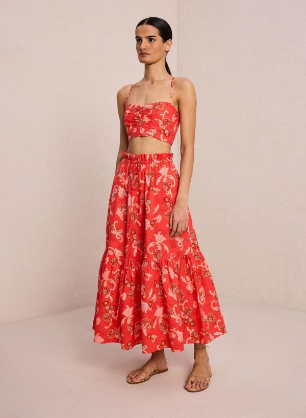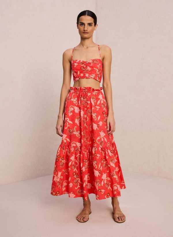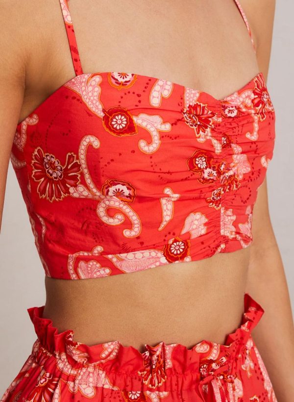 The Arit Top is crafted from crisp day cotton fabric in a red floral print. This cropped silhouette features a sweetheart neckline with thin adjustable straps that crisscross in the back and a gathered and smocked bodice. This style runs true to size.