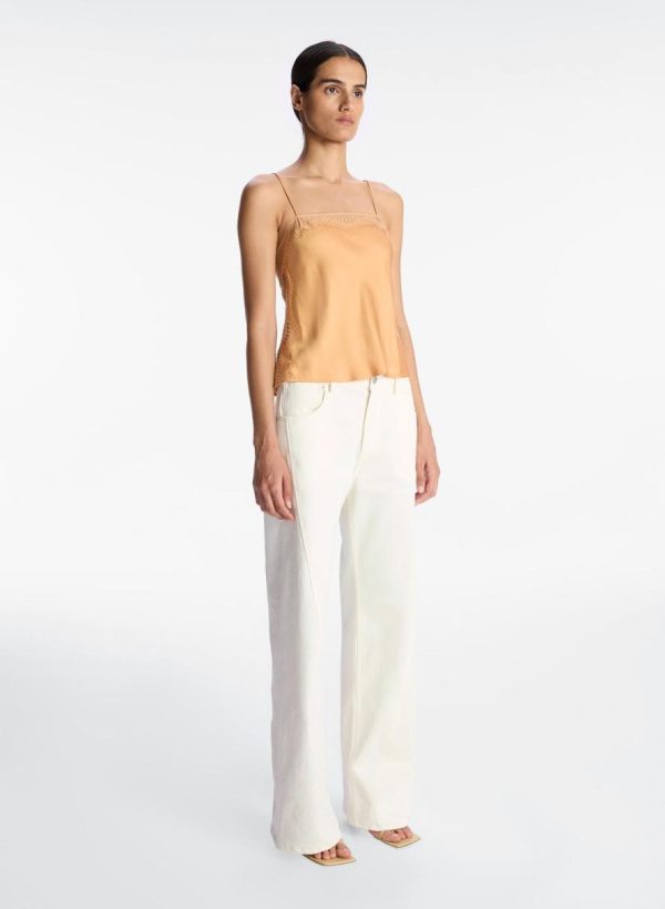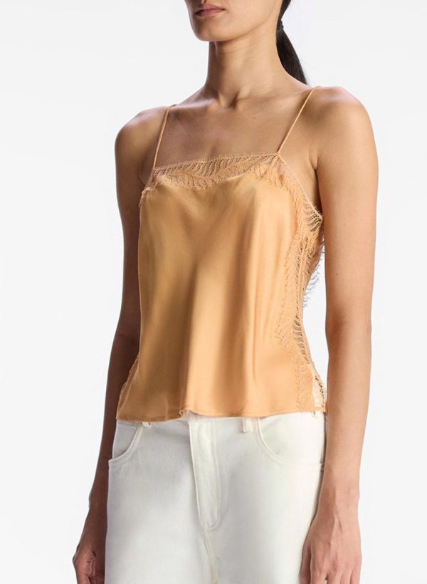 The Sandy Top is crafted from a fluid viscose fabric in a luminous beige shade. This camisole silhouette features delicate straps, and a straight, modern neckline edged in eyelash lace.