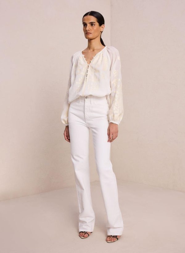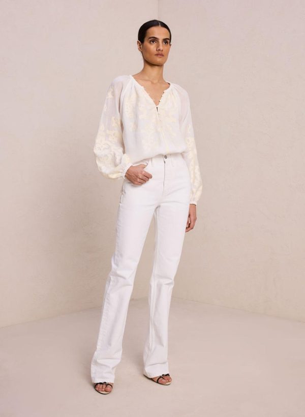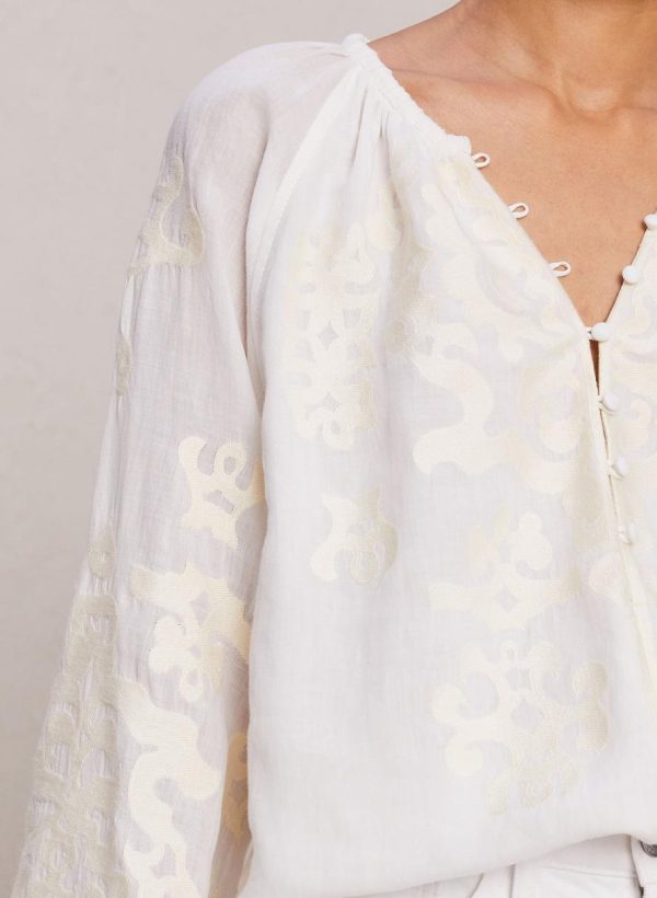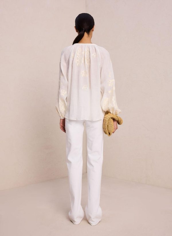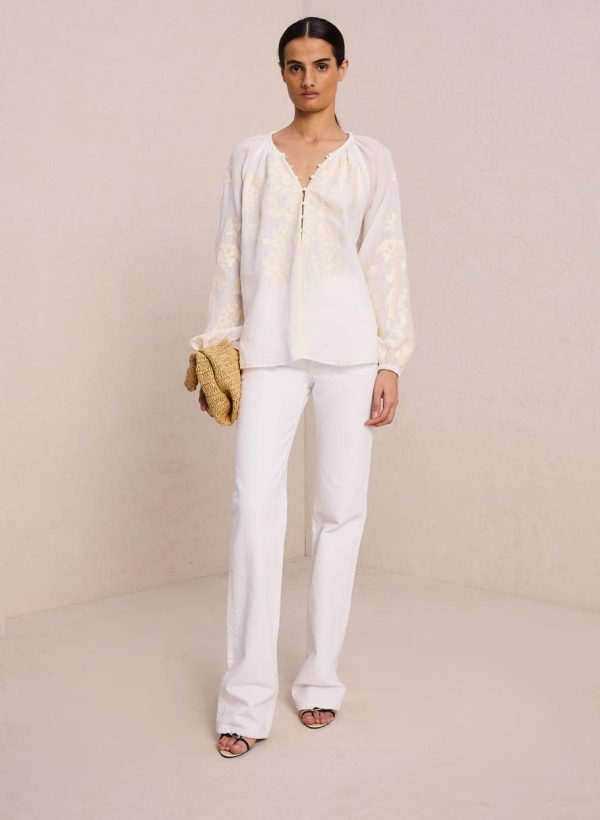 The Capri Top is crafted from embroidered ramie fabric in summer white. This flowing silhouette buttons down and features dropped shoulders with long voluminous sleeves. This style runs true to size.