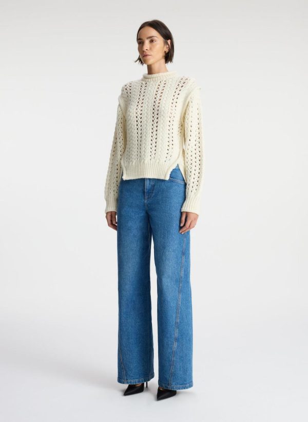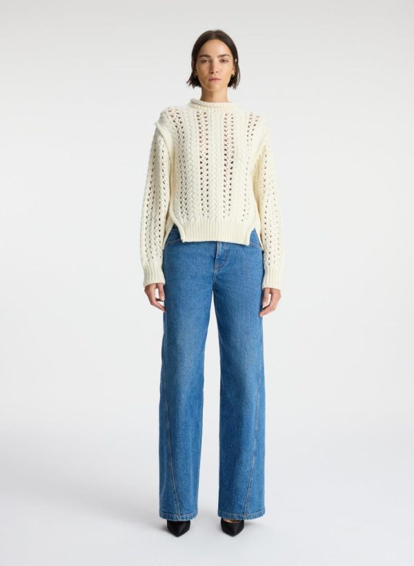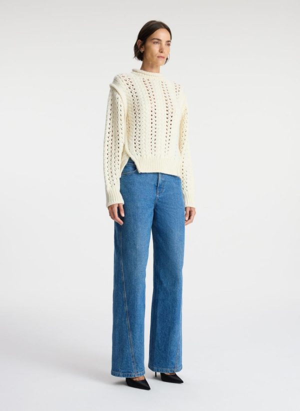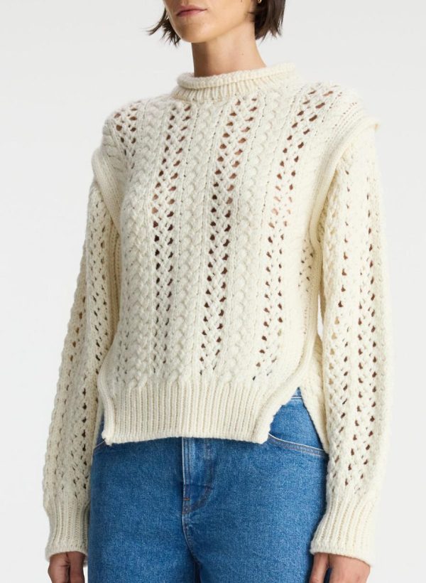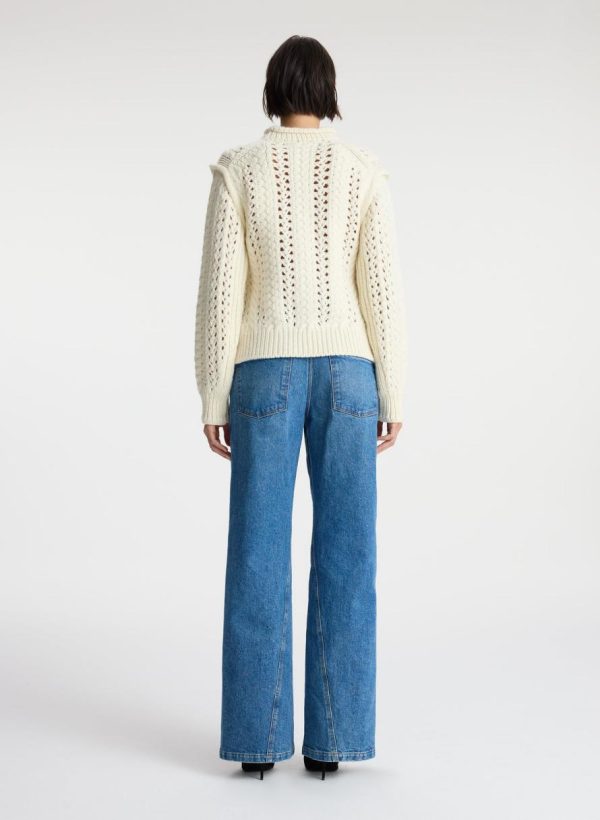 The Chandler Sweater is crafted of a luxe wool fabric in a versatile off-white hue. This cropped silhouette features an open cable knit pattern, with a high roll neckline, TKTKTK shoulder detailing, and cutouts at the hips.