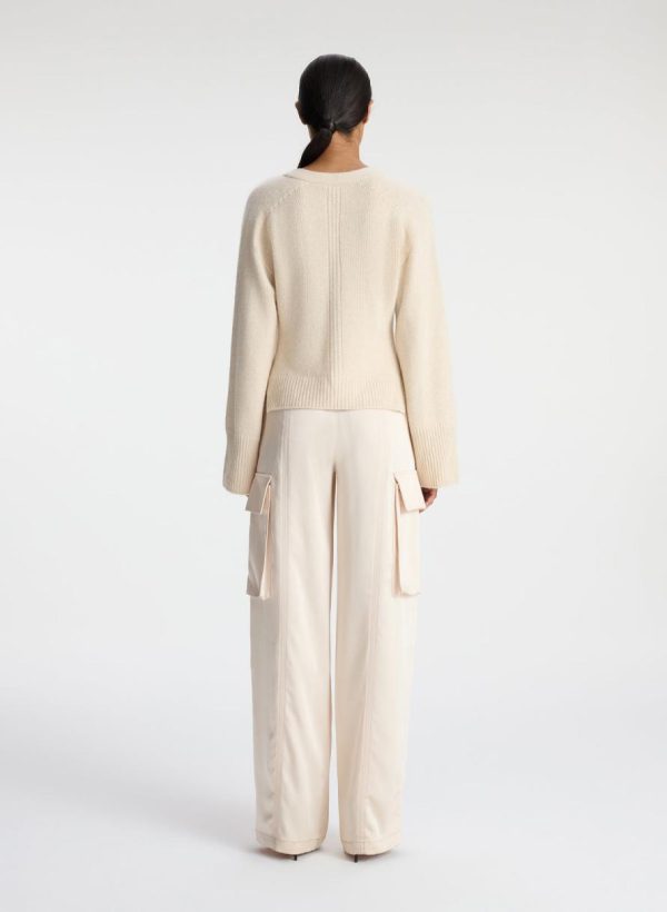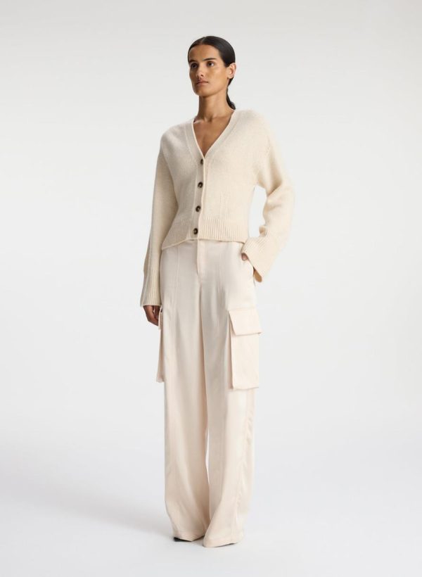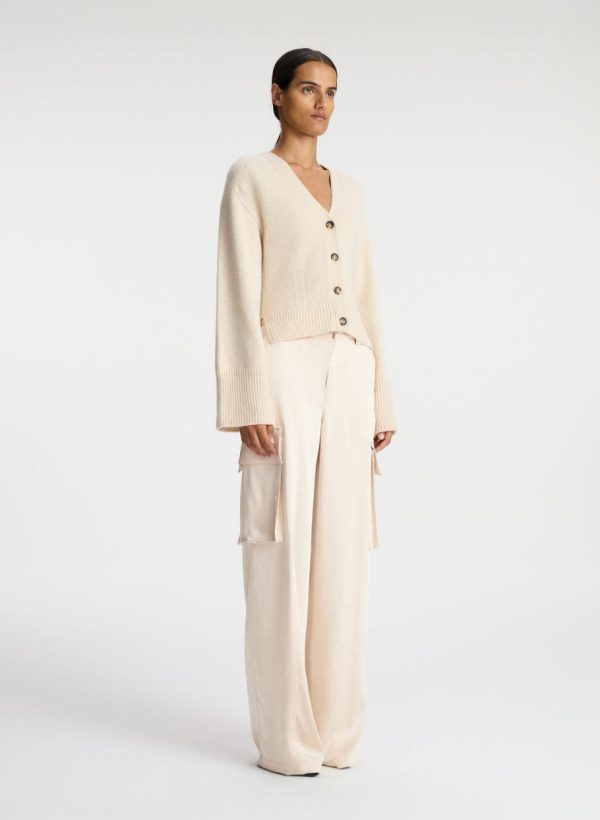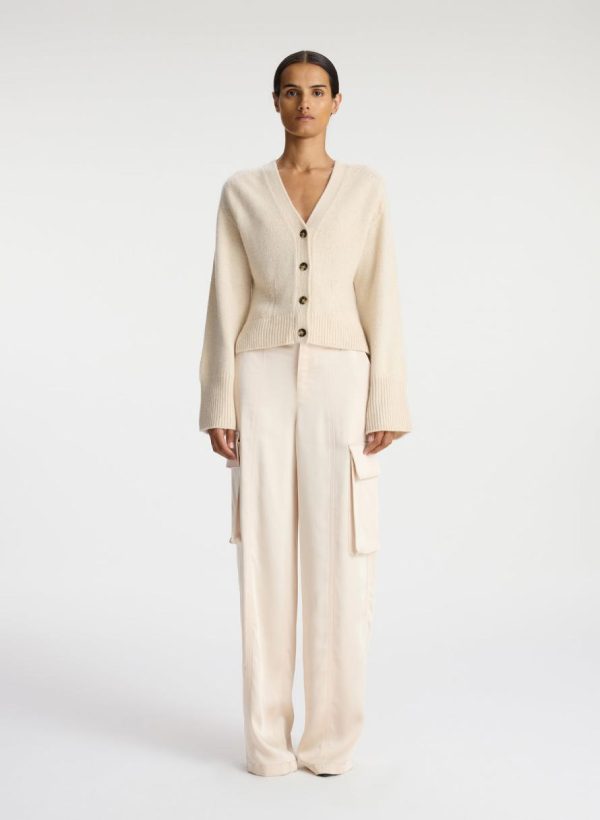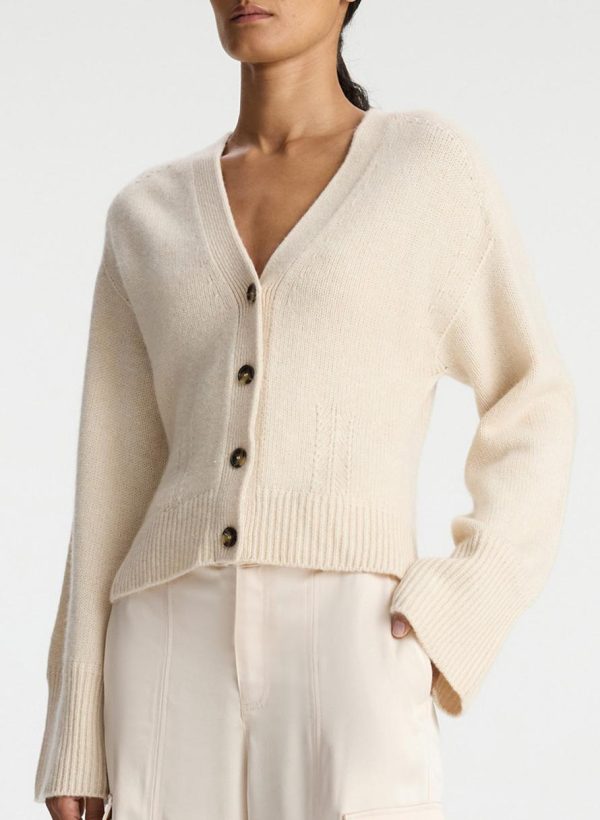 The Henry Cardigan is crafted of seamless cashmere in a creamy hue. Extra-long bell sleeves modernize this classic silhouette as a button-down V-neckline, and ribbing along the hems and cuffs maintains timelessness.