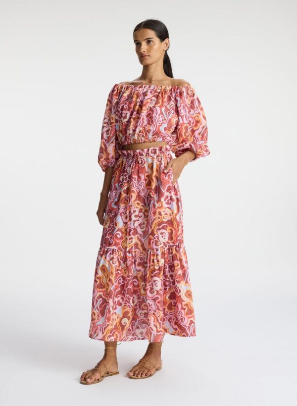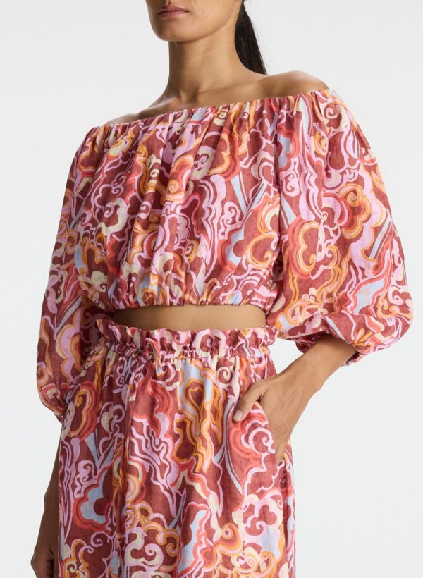 The Katherine Top is crafted of our linen fabric in an abstract clay floral print. This cropped, off-the-shoulder silhouette features an elasticized neckline and hem with long billowing sleeves and pleated detailing.
