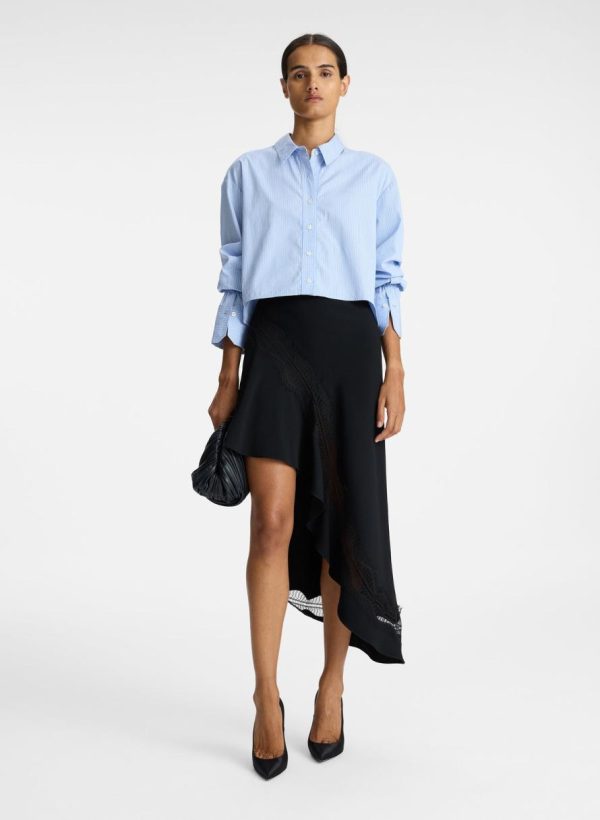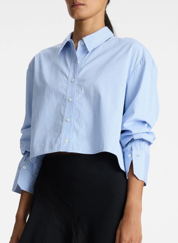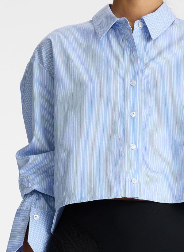 The Monica II Top is crafted from our crisp cotton fabric in a timeless blue-and-white stripe. For a modern twist on classic shirting, this cropped button-down silhouette features exaggerated cuffed sleeves with an elasticized detail that allows for an effortless scrunched-up effect.