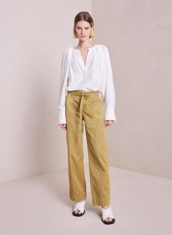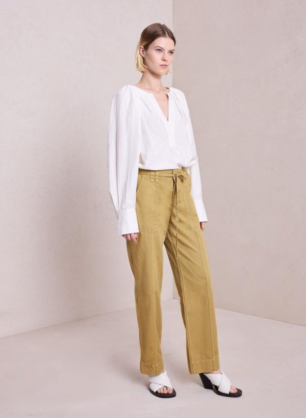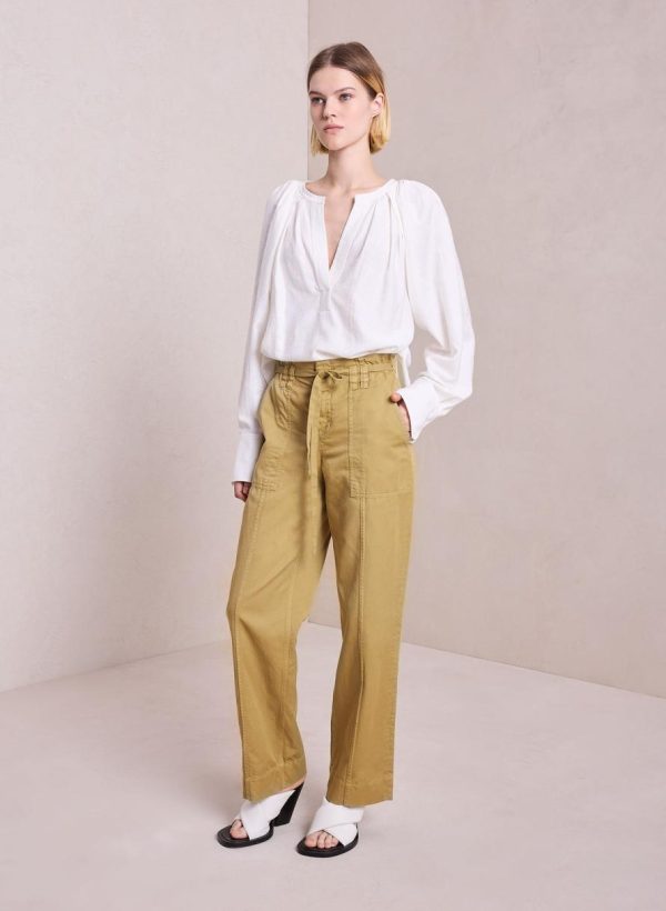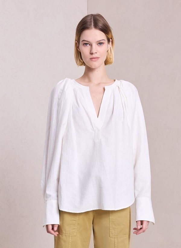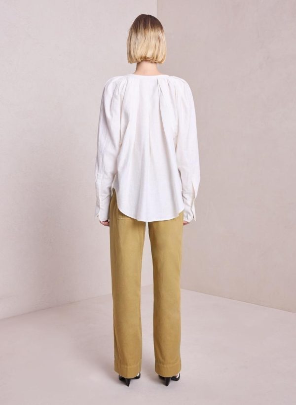 The Nomad Top is crafted from an airy linen-cotton blend in crisp white. This voluminous and pleated silhouette features long cuffed sleeves and a V-shaped placket neckline. This style runs true to size.