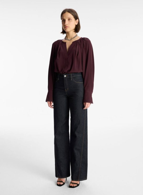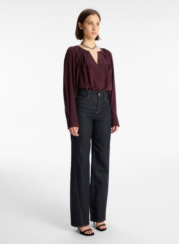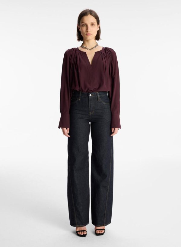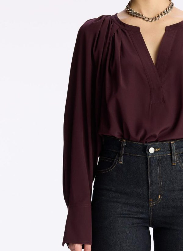 The Nomad Top is crafted from a solid stretch silk fabric in a deep plum hue. This polished silhouette features voluminous cuffed sleeves and a V-shaped placket neckline with pleating through the back.