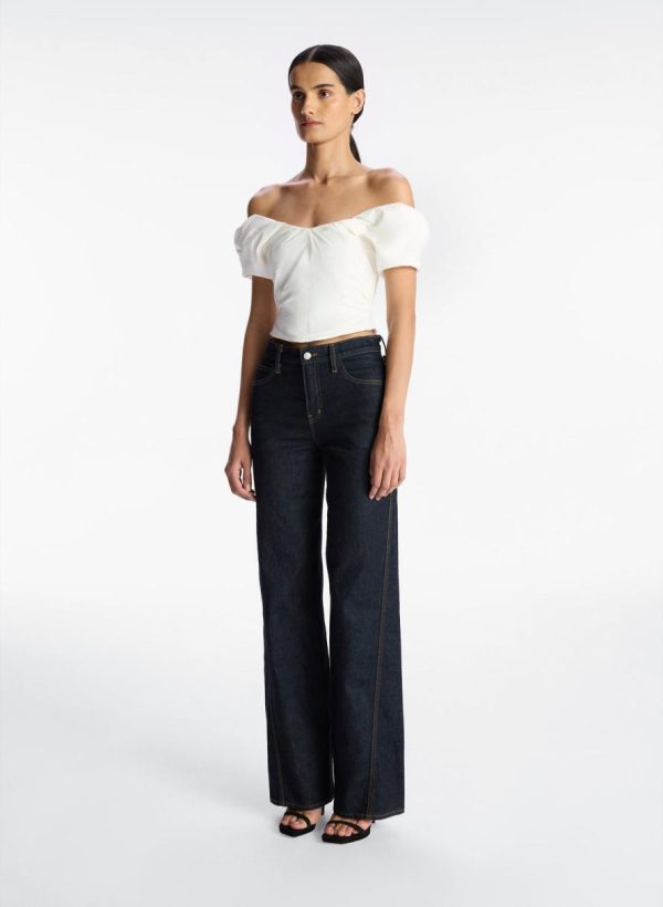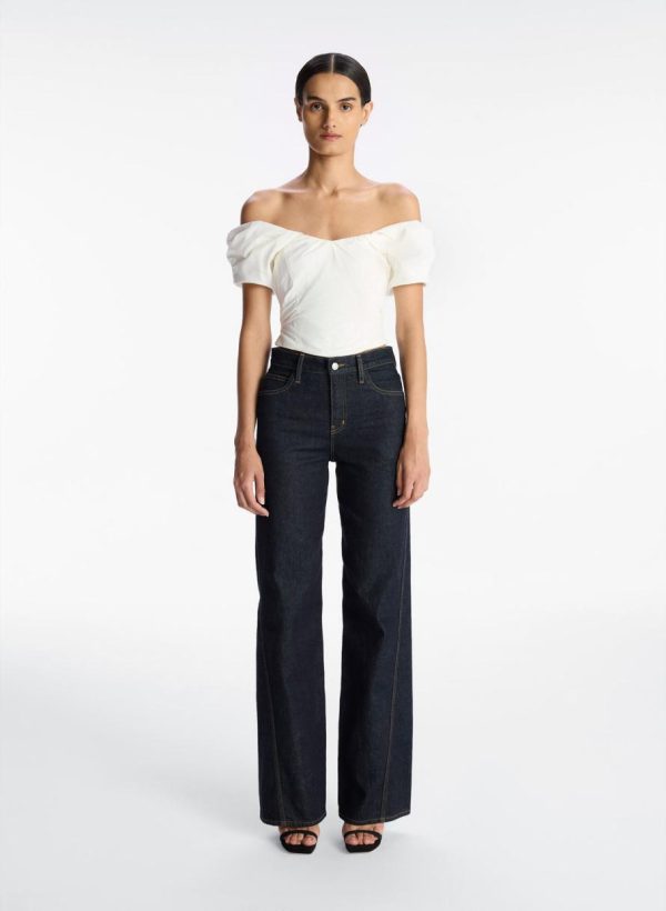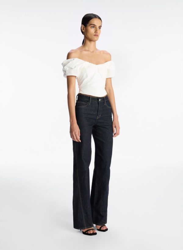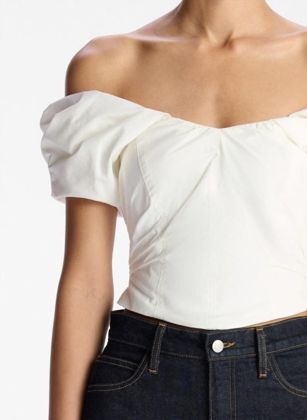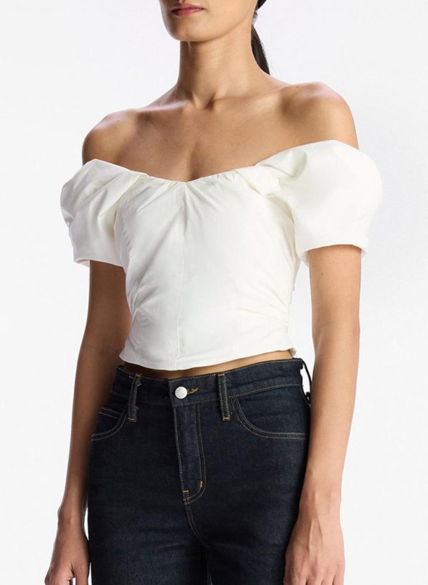 The Nora Top is crafted from a tech radzimir fabric in timeless white. This off-the-shoulder silhouette is cropped, featuring puff sleeves and a svelte, curved-hemmed bodice.
