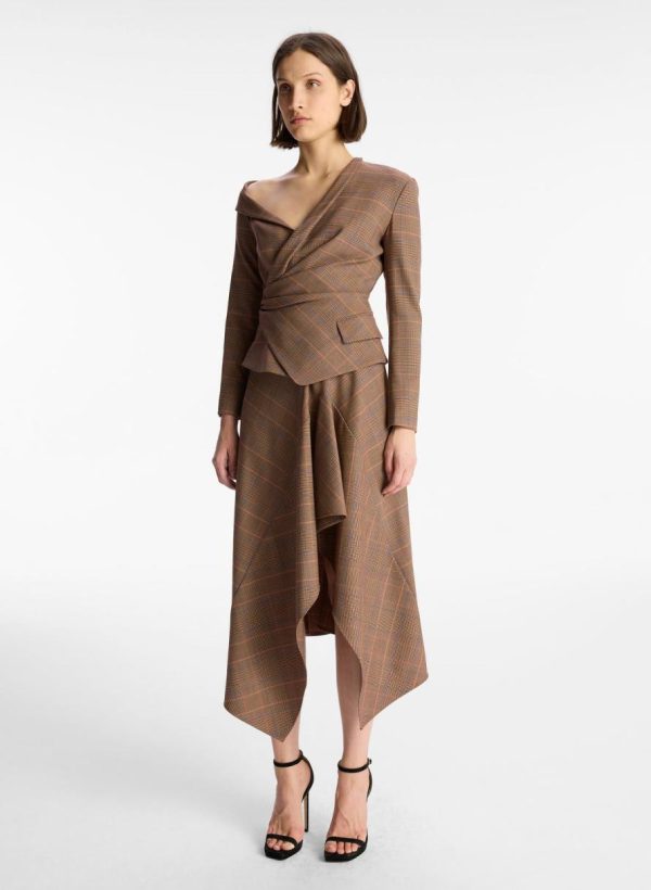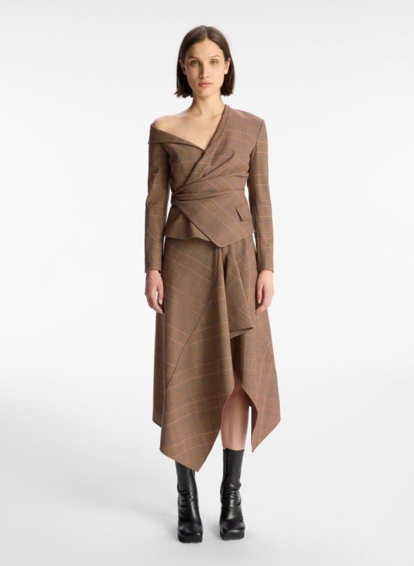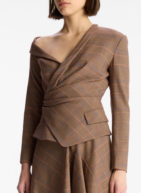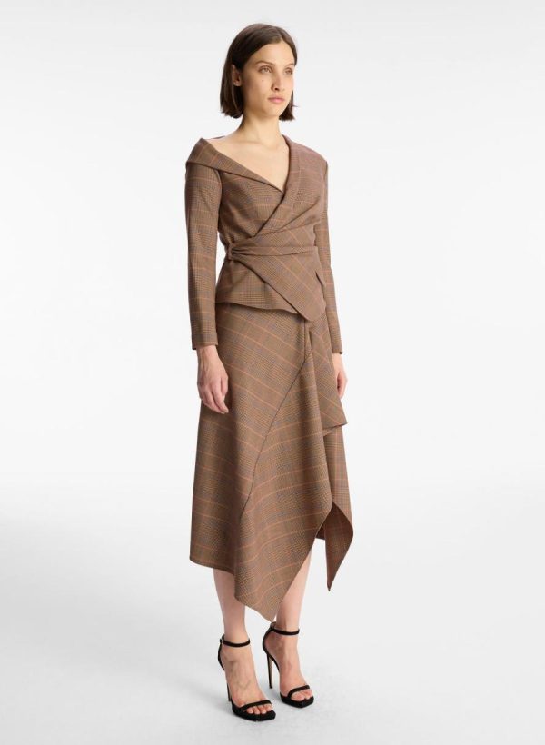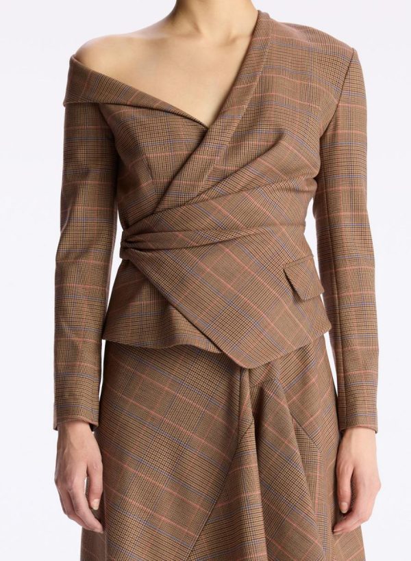 The Skyla Top is crafted of structured wool blend tailoring fabric in a brown heritage check pattern. This asymmetrical silhouette features long sleeves, a single off-shoulder neckline, and a wrapped waist that secures with a button.
